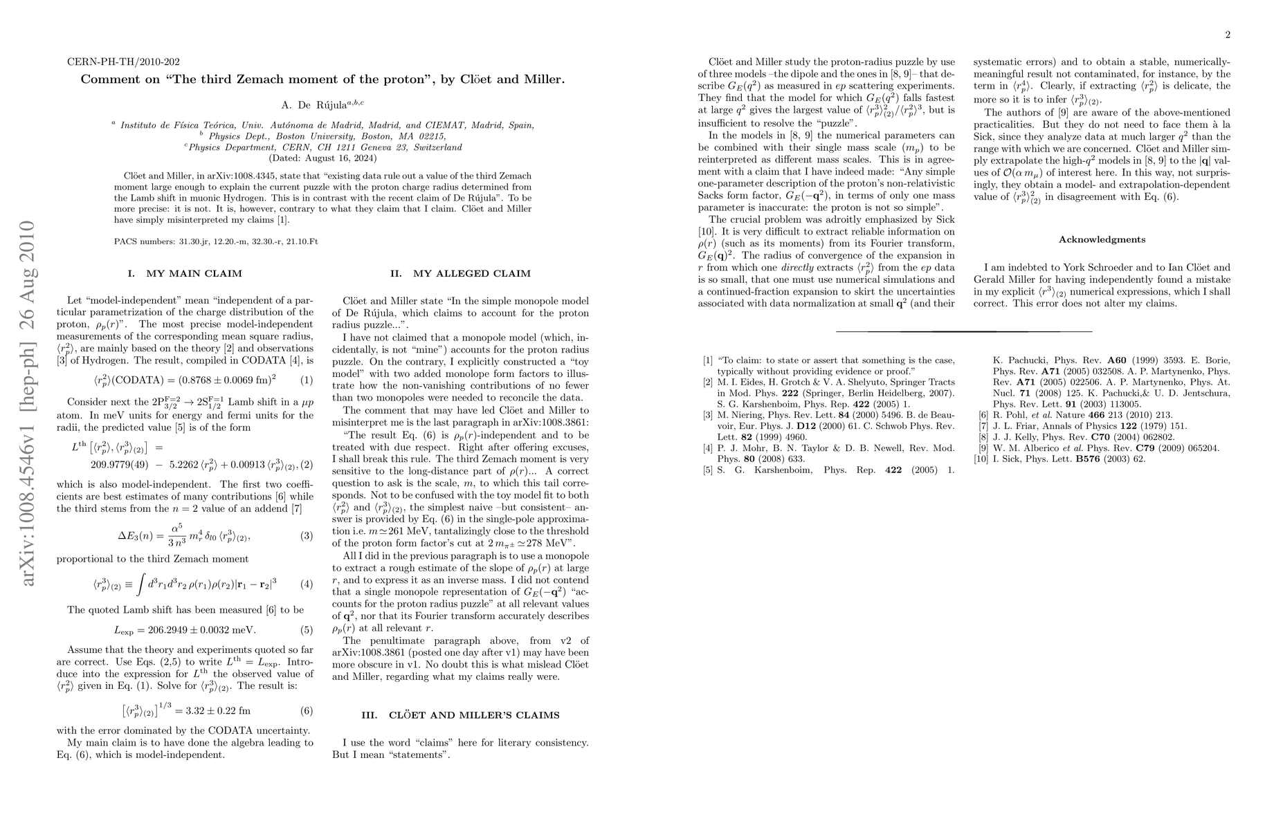 Cloet and Miller, in arXiv:1008.4345, state that "existing data rule out a value of the third Zemach moment large enough to explain the current puzzle with the proton charge radius determined from the Lamb shift in muonic Hydrogen. This is in contrast with the recent claim of De R\'ujula [arXiv:1008.3861]". To be more precise: it is not. It is, however, contrary to what they claim that I claim. Cloet and Miller have simply misinterpreted my claims.
