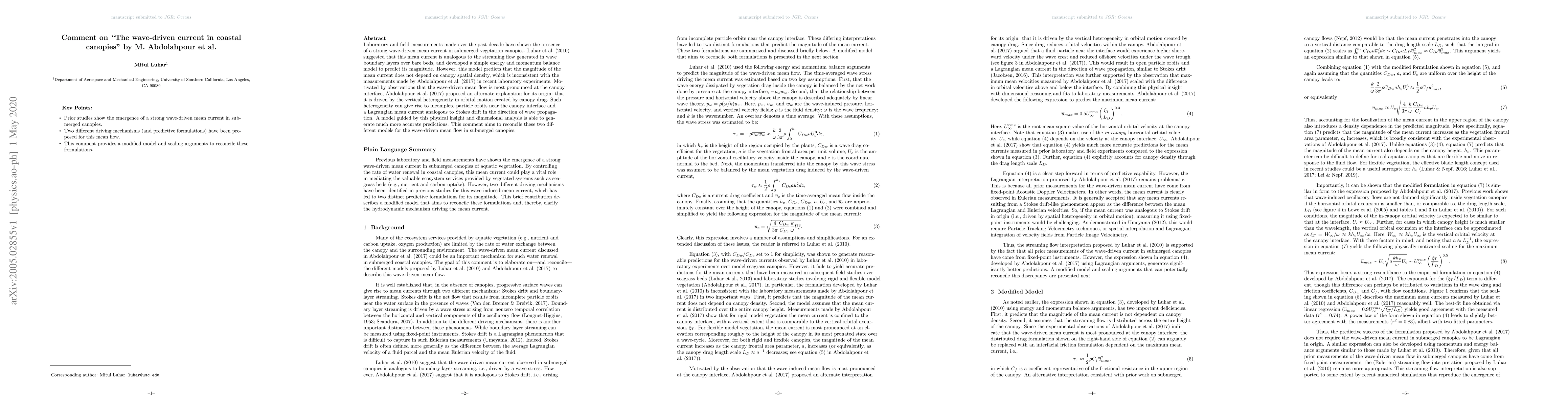 Laboratory and field measurements made over the past decade have shown the presence of a strong wave-driven mean current in submerged vegetation canopies. Luhar et al. (2010) suggested that this mean current is analogous to the streaming flow generated in wave boundary layers over bare beds, and developed a simple energy and momentum balance model to predict its magnitude. However, this model predicts that the magnitude of the mean current does not depend on canopy spatial density, which is inconsistent with the measurements made by Abdolahpour et al. (2017) in recent laboratory experiments. Motivated by observations that the wave-driven mean flow is most pronounced at the canopy interface, Abdolahpour et al. (2017) proposed an alternate explanation for its origin: that it is driven by the vertical heterogeneity in orbital motion created by canopy drag. Such heterogeneity can give rise to incomplete particle orbits near the canopy interface and a Lagrangian mean current analogous to Stokes drift in the direction of wave propagation. A model guided by this physical insight and dimensional analysis is able to generate much more accurate predictions. This comment aims to reconcile these two different models for the wave-driven mean flow in submerged canopies.