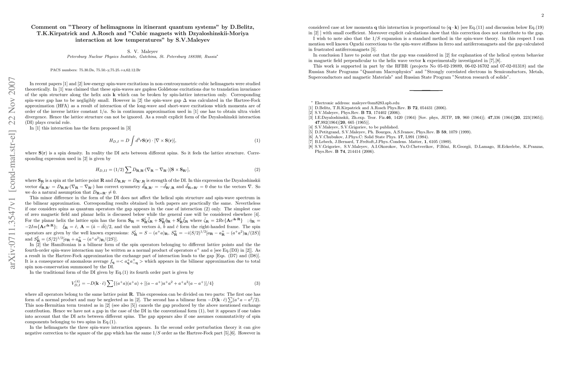 Comment on "Theory of helimagnons in itinerant quantum systems" by D.Belitz, T.K.Kirpatrick and A.Rosch and "Cubic magnets with Dzyaloshinskii-Moriya interaction at low temperatures" by S.V.Maleyev