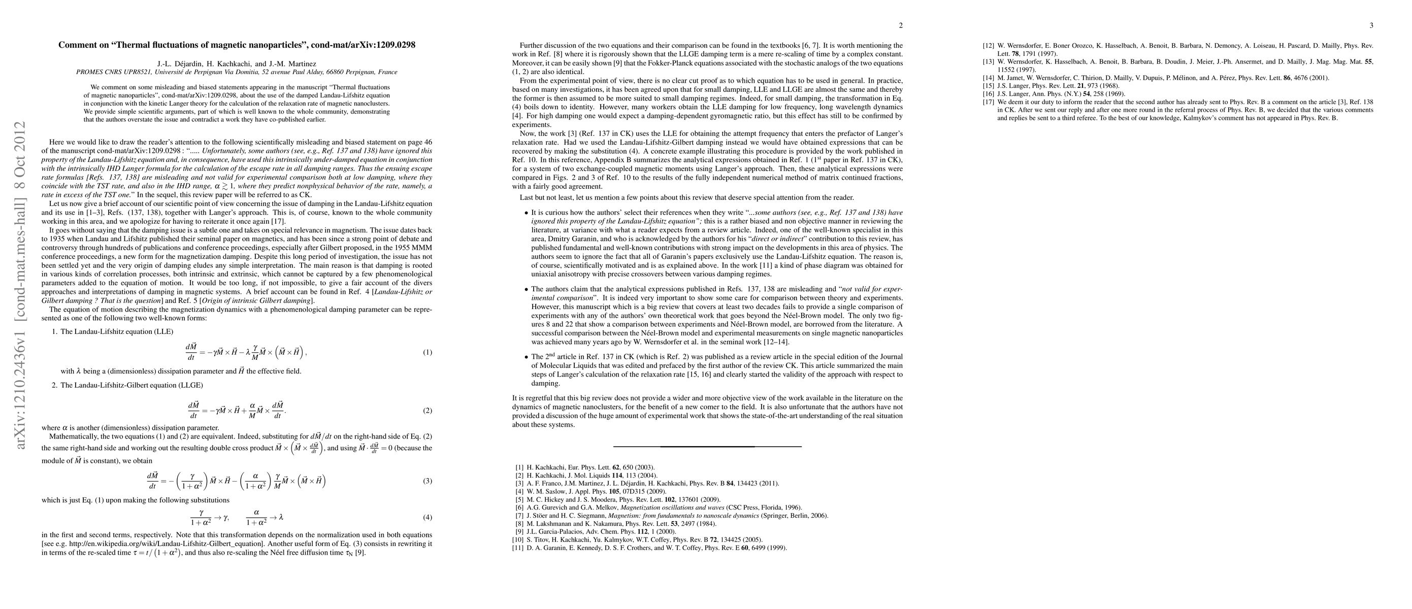 We comment on some misleading and biased statements appearing in the manuscript arXiv:1209.0298 ("Thermal fluctuations of magnetic nanoparticles") about the use of the damped Landau-Lifshitz equation and the kinetic Langer theory for the calculation of the relaxation rate of magnetic nanoclusters. We reiterate simple scientific arguments, part of which is well known to the whole community, demonstrating that the authors' criticisms are unfounded and that they overstate the issue of damping in the Landau-Lifshitz equation with no unanimous experimental evidence.