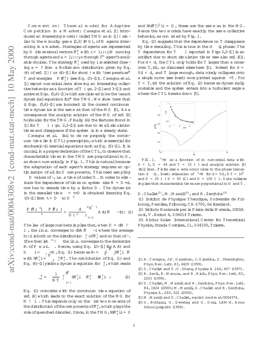 We show that the dynamical equations describing the collective behavior of the model introduced by Cavagna et al. i) are not their Eqs. (5,6) but rather ii) are the same as those of the minority game (MG). As a consequence the analytic solution of the MG presented in [PRL, 84, 1824 (2000)] holds also for this model. Finally we show that iii) the the large temperature behavior of the model is different, due to small simulation times, from that discussed by Cavagna et al.