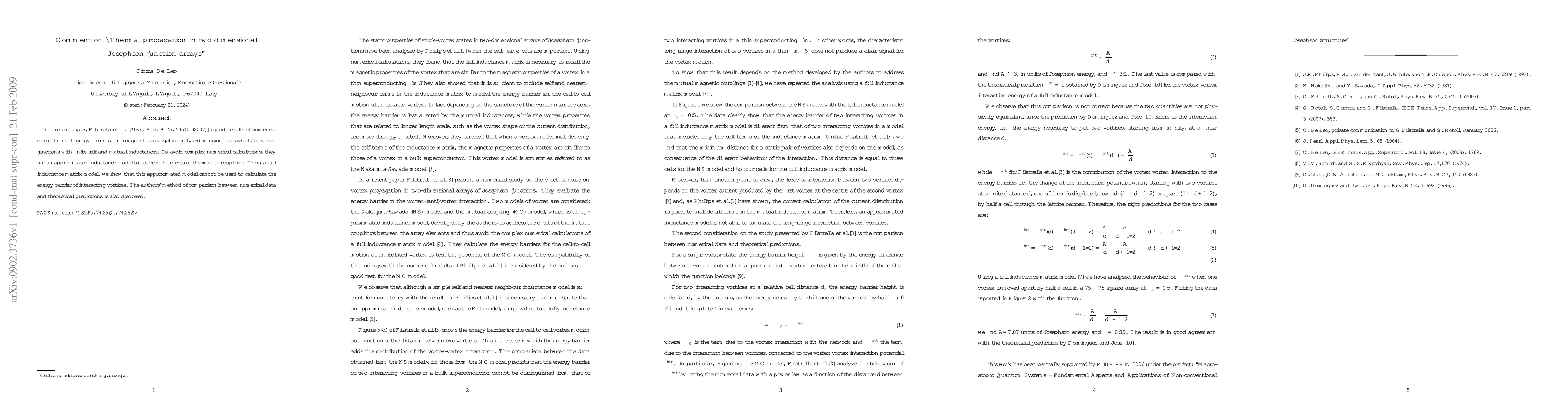 In a recent paper, Filatrella et al. [Phys. Rev. B 75, 54510 (2007)] report results of numerical calculations of energy barriers for flux quanta propagation in two-dimensional arrays of Josephson junctions with finite self and mutual inductances. To avoid complex numerical calculations, they use an approximated inductance model to address the effects of the mutual couplings. Using a full inductance matrix model, we show that this approximated model cannot be used to calculate the energy barrier of interacting vortices. The authors' method of comparison between numerical data and theoretical predictions is also discussed.