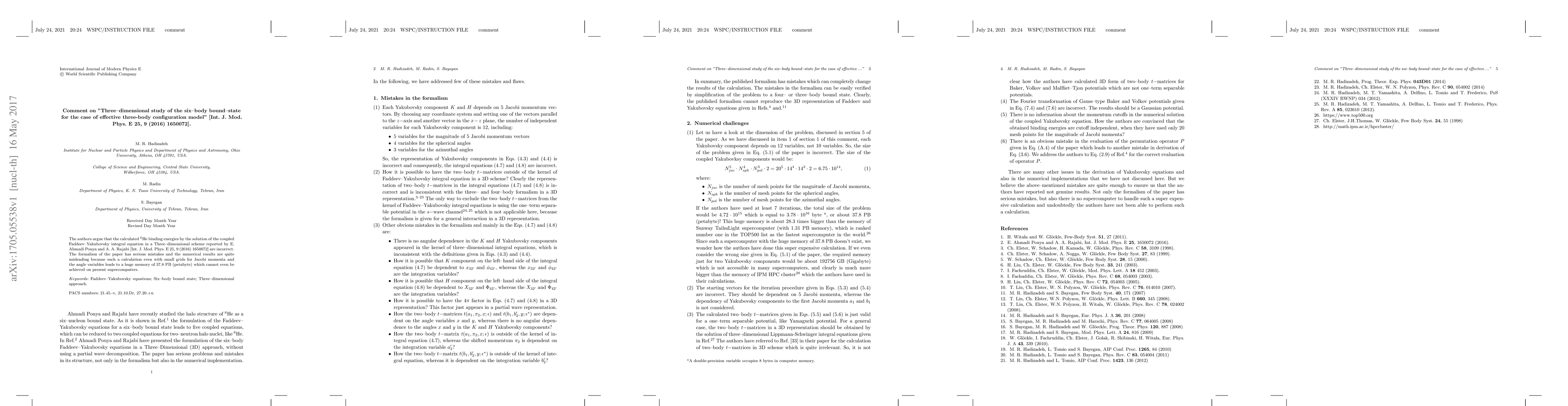 The authors argue that the calculated $^6$He binding energies by the solution of the coupled Faddeev-Yakubovsky integral equation in a Three-dimensional scheme reported by E. Ahmadi Pouya and A. A. Rajabi [Int. J. Mod. Phys. E 25, 9 (2016) 1650072] are incorrect. The formalism of the paper has serious mistakes and the numerical results are quite misleading because such a calculation even with small grids for Jacobi momenta and the angle variables leads to a huge memory of 37.8 PB (petabyte) which cannot even be achieved on present supercomputers.