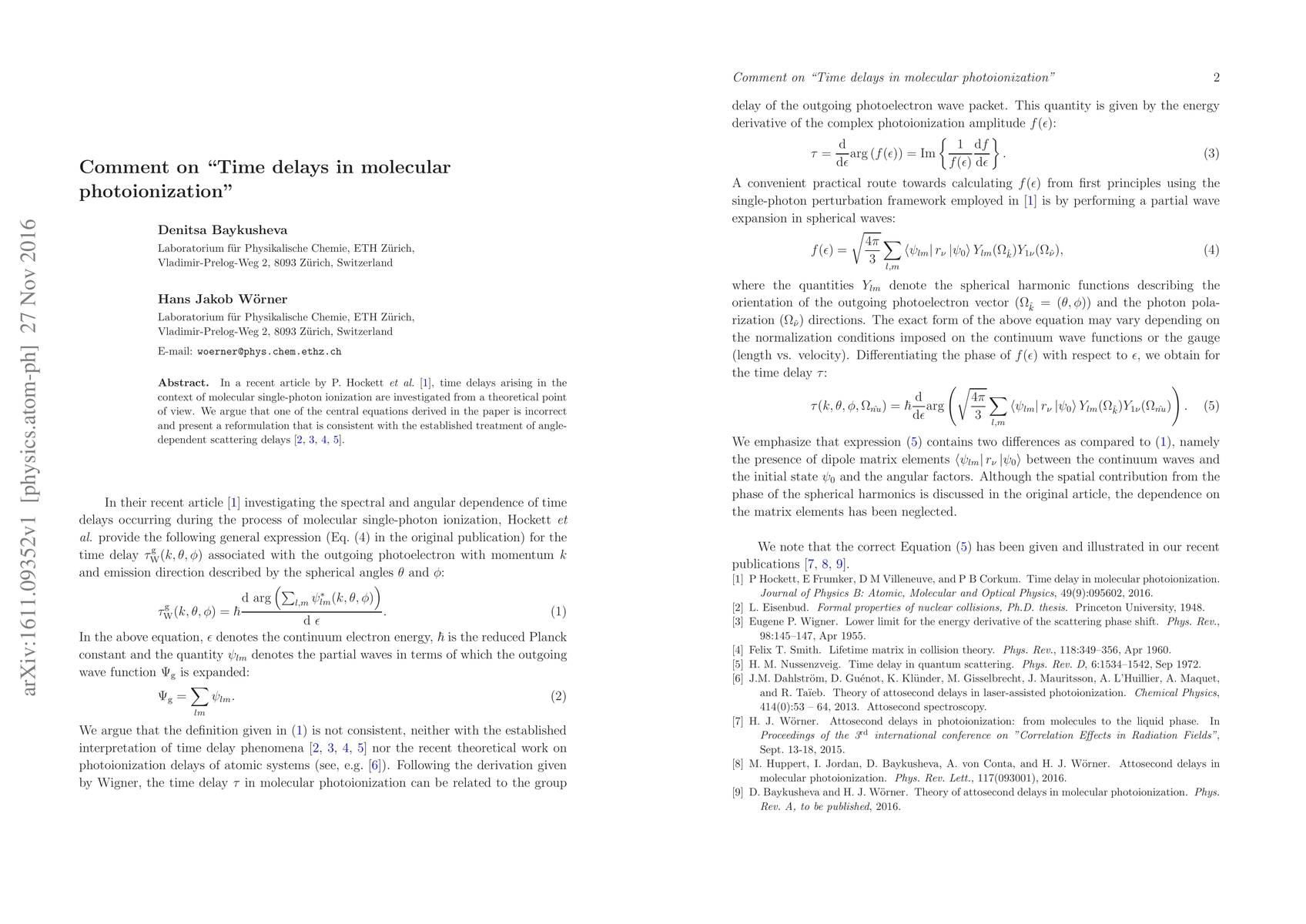 This comment disputes an equation in Hockett et al.'s study on molecular ionization time delays, proposing a corrected version in line with established scattering delay theories.