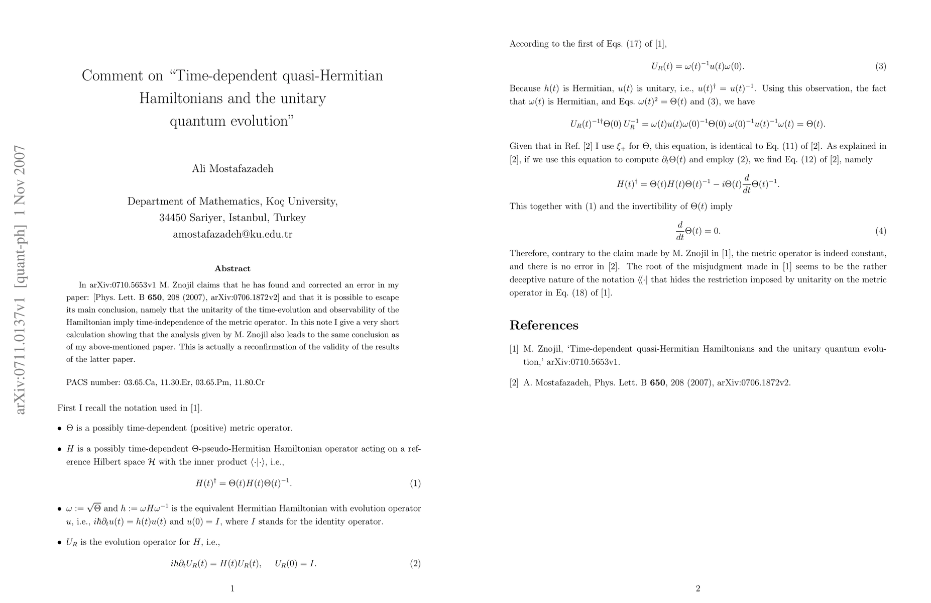 In arXiv:0710.5653v1 M. Znojil claims that he has found and corrected an error in my paper: [Phys. Lett. B \textbf{650}, 208 (2007), arXiv:0706.1872v2] and that it is possible to escape its main conclusion, namely that the unitarity of the time-evolution and observability of the Hamiltonian imply time-independence of the metric operator. In this note I give a very short calculation showing that the analysis given by M. Znojil also leads to the same conclusion as of my above-mentioned paper. This is actually a reconfirmation of the validity of the results of the latter paper.