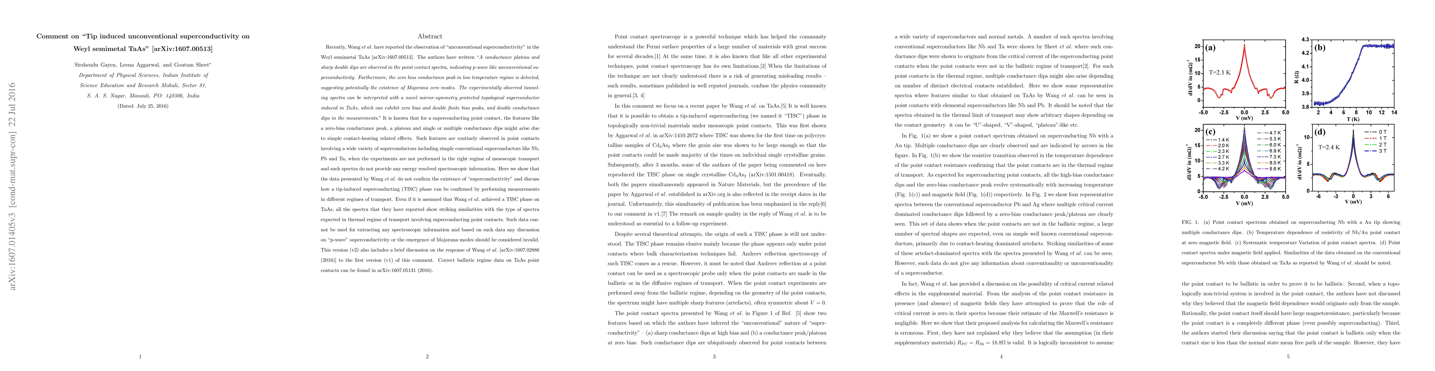 Recently, Wang $et$ $al.$ have reported the observation of "unconventional superconductivity" in the Weyl semimetal TaAs [arXiv:1607.00513]. The authors have written "\textit{A conductance plateau and sharp double dips are observed in the point contact spectra, indicating p-wave like unconventional superconductivity. Furthermore, the zero bias conductance peak in low temperature regime is detected, suggesting potentially the existence of Majorana zero modes. The experimentally observed tunneling spectra can be interpreted with a novel mirror-symmetry protected topological superconductor induced in TaAs, which can exhibit zero bias and double finite bias peaks, and double conductance dips in the measurements}." In this comment we show that for a superconducting point contact, the features like a zero-bias conductance peak, a plateau and single or multiple conductance dips might arise due to simple contact-heating related effects. Such features are routinely observed in point contacts involving a wide variety of superconductors when the experiments are not performed in the right regime of mesoscopic transport. We also show that the data presented by Wang $et$ $al.$ in a single transport regime of point contact do not confirm tip induced superconductivity (TISC). Even if it is assumed that Wang $et$ $al.$ achieved TISC on TaAs, all the spectra that they have reported show striking similarities with the type of spectra expected in thermal regime of transport. Such data cannot be used for extracting any spectroscopic information and based on such data any discussion on "p-wave" superconductivity or the emergence of Majorana modes should be considered invalid. This version (v2) also includes a brief discussion on the response of Wang $et$ $al.$ to the first version (v1) of this comment. Correct ballistic regime data on TaAs point contacts can be found in arXiv:1607.05131 (2016).
