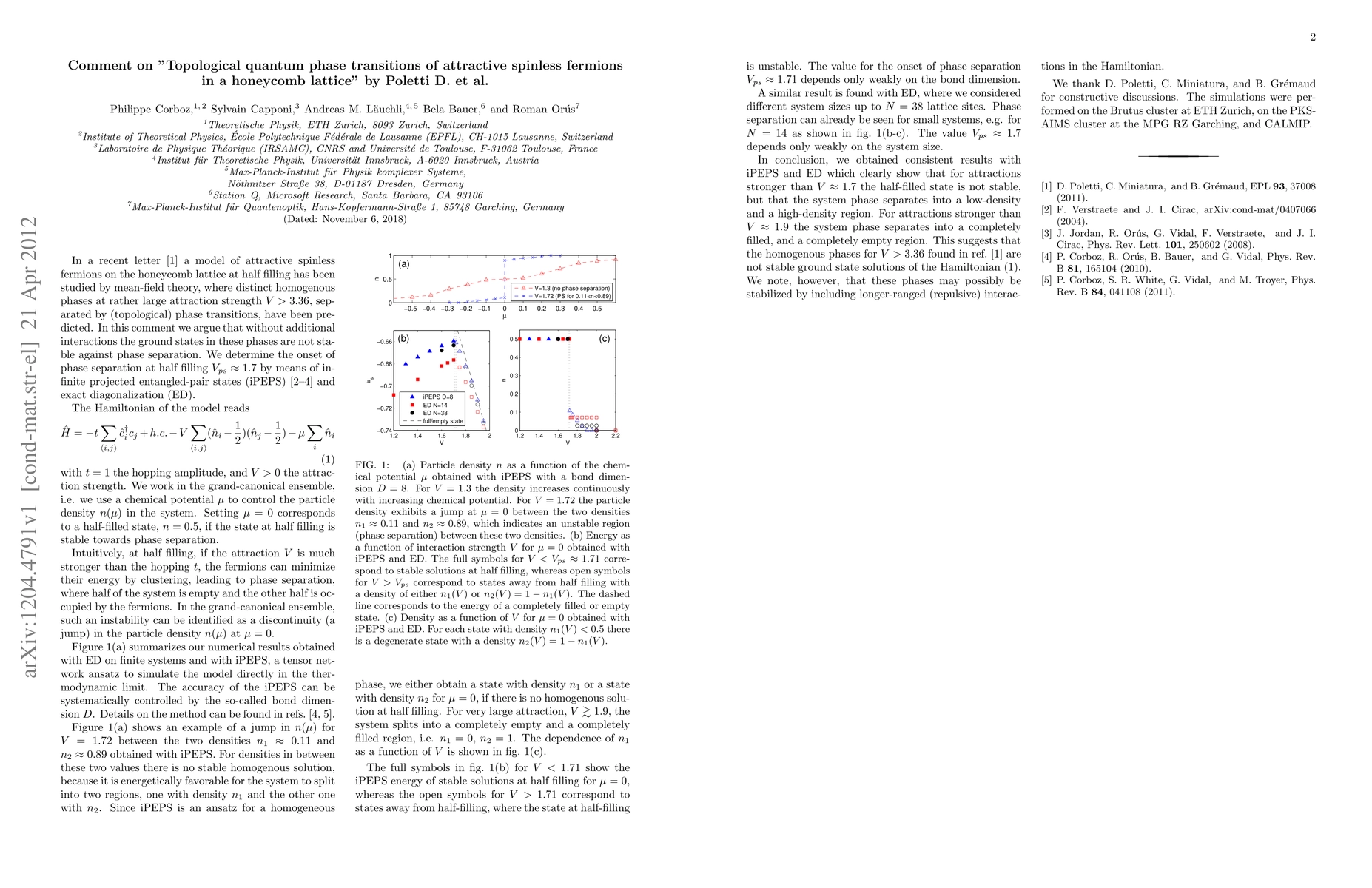 This comment critiques the stability of phases predicted by Poletti et al. for attractive spinless fermions on a honeycomb lattice, arguing that without additional interactions, these phases are prone to phase separation. The authors determine the onset of phase separation using iPEPS and exact diagonalization, finding it occurs at $V_{ps}\approx 1.7$.