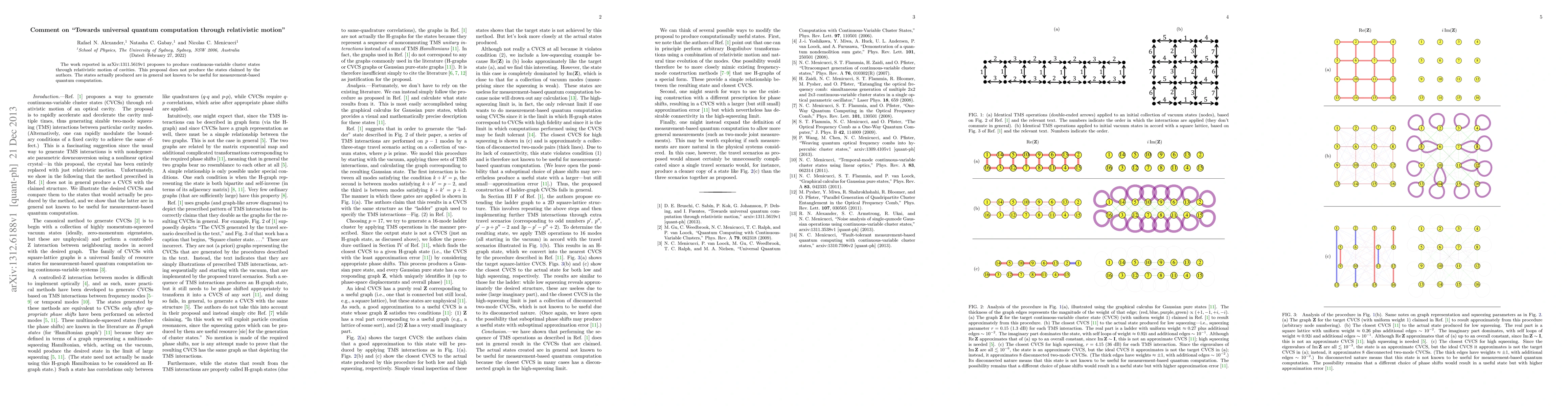 The work reported in arXiv:1311.5619v1 proposes to produce continuous-variable cluster states through relativistic motion of cavities. This proposal does not produce the states claimed by the authors. The states actually produced are in general not known to be useful for measurement-based quantum computation.