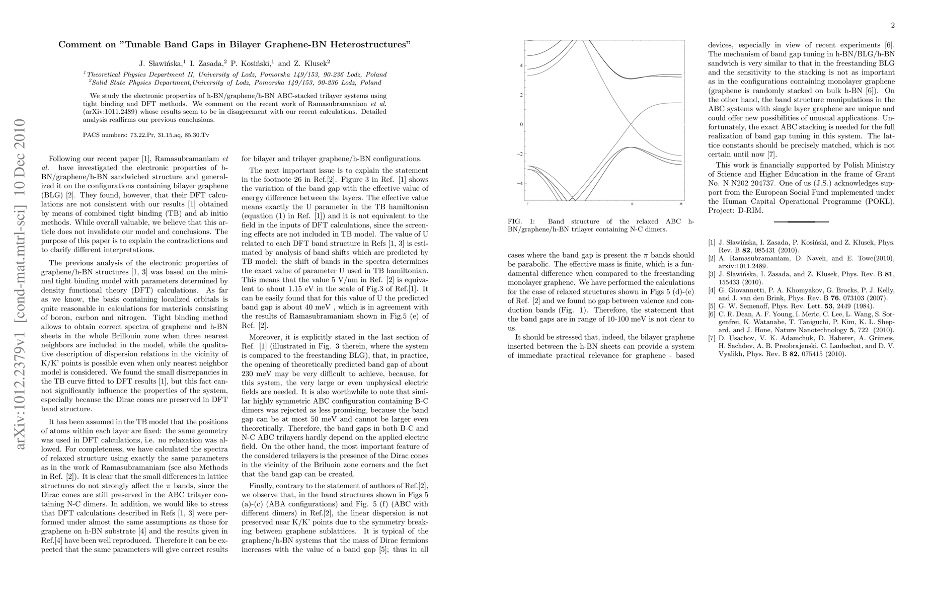 We study the electronic properties of h-BN/graphene/h-BN ABC-stacked trilayer systems using tight binding and DFT methods. We comment on the recent work of Ramasubramaniam et al. (arxiv:1011.2489) whose results seem to be in disagreement with our recent calculations. Detailed analysis reaffirms our previous conclusions.