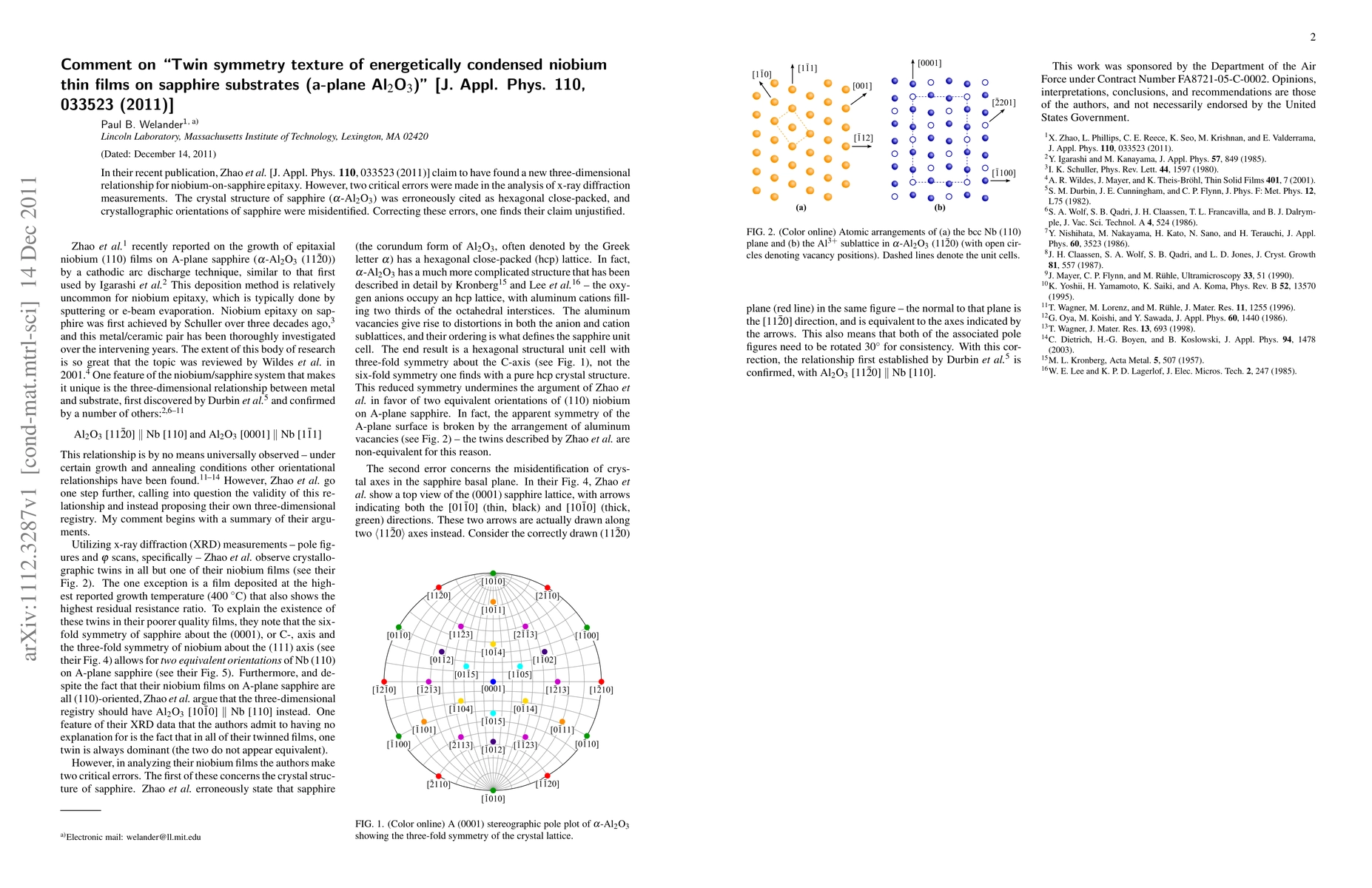 In their recent publication, Zhao et al. [J. Appl. Phys. 110, 033523 (2011)] claim to have found a new three-dimensional relationship for niobium-on-sapphire epitaxy. However, two critical errors were made in the analysis of x-ray diffraction measurements. The crystal structure of sapphire (alpha-Al2O3) was erroneously cited as hexagonal close-packed, and crystallographic orientations of sapphire were misidentified. Correcting these errors, one finds their claim unjustified.