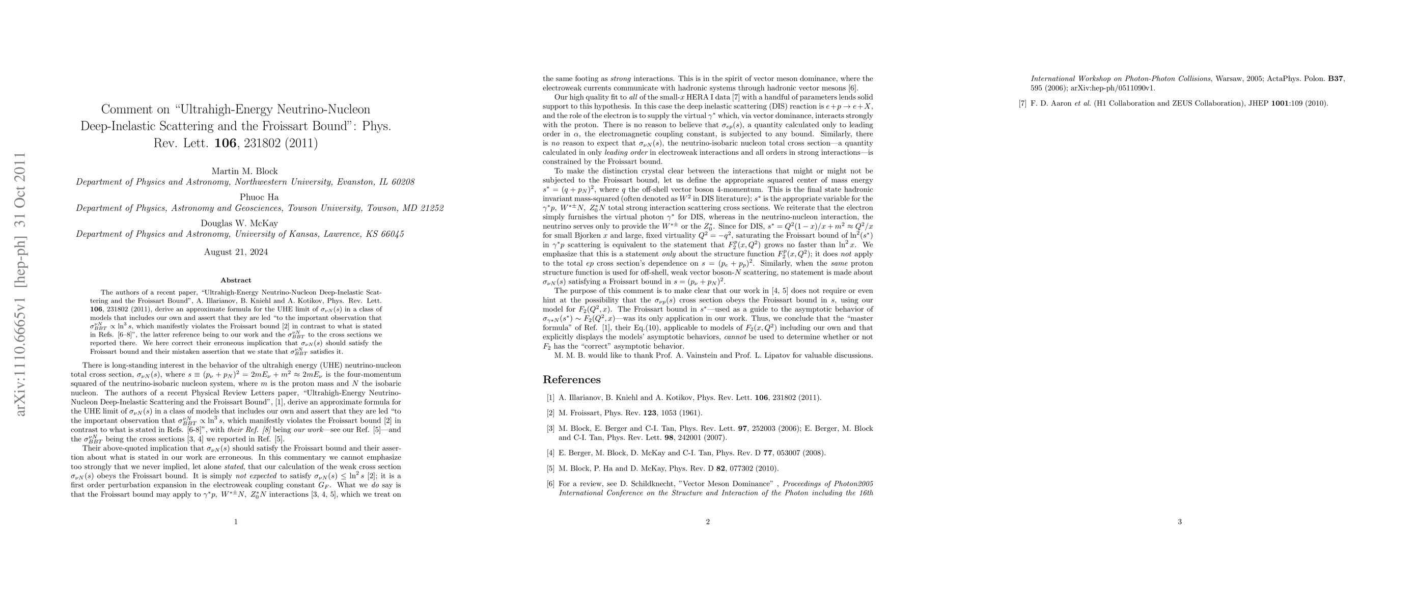 The authors of a recent paper, "Ultrahigh-Energy Neutrino-Nucleon Deep-Inelastic Scattering and the Froissart Bound", A. Illarianov, B. Kniehl and A. Kotikov, Phys. Rev. Lett. 106, 231802 (2011), derive an approximate formula for the UHE limit of $\sigma_{\nu N}(s)$ in a class of models that includes our own and assert that they are led "to the important observation that $\sigma_{BBT}^{\nu N} \propto ln^3s$, which manifestly violates the Froissart bound [2] in contrast to what is stated in Refs. [6-8]", the latter reference being to our work and the $\sigma_{BBT}^{\nu N}$ to the cross sections we reported there. We here correct their erroneous implication that $\sigma_{\nu N}(s) should satisfy the Froissart bound and their mistaken assertion that we state that $\sigma_{BBT}^{\nu N}$ satisfies it.