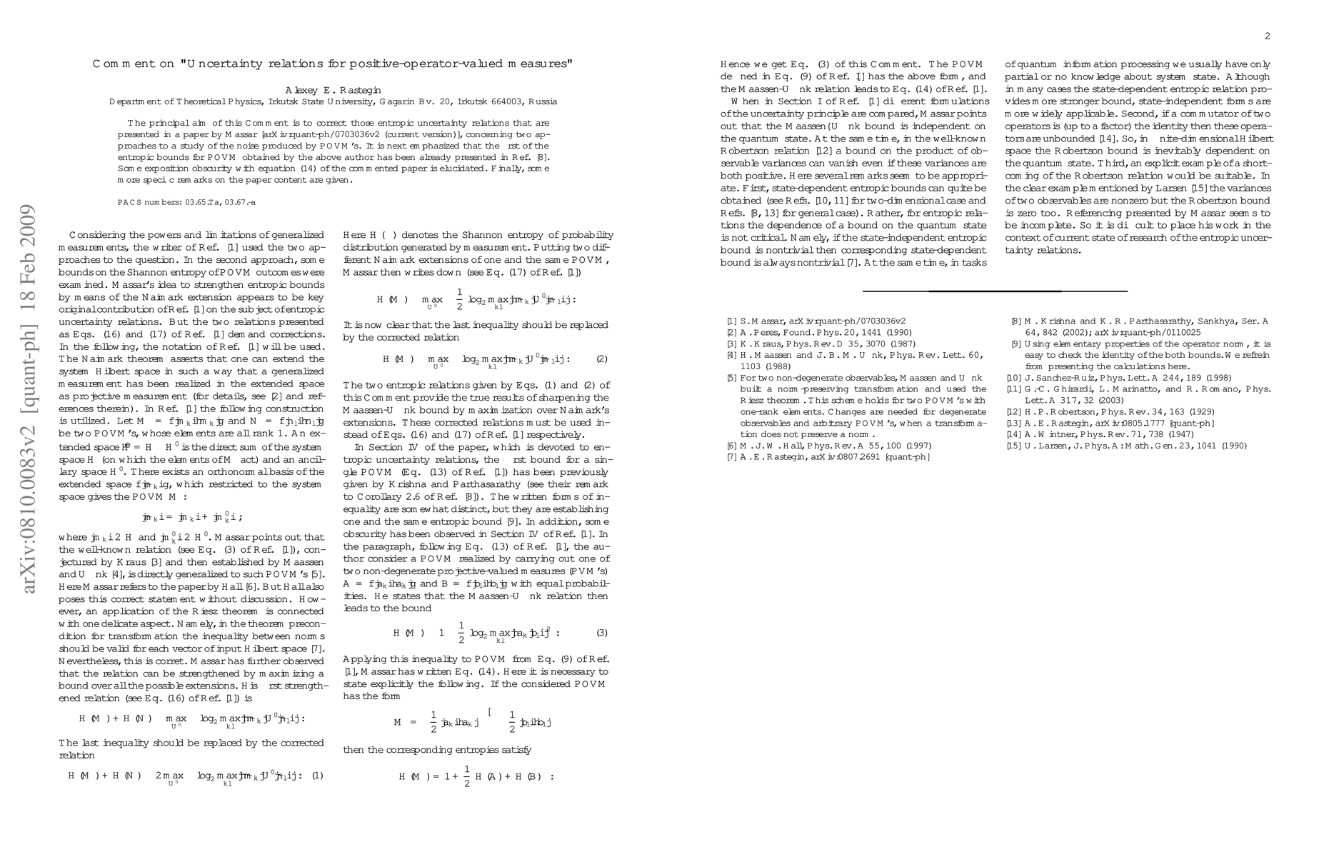 The principal aim of this Comment is to correct those entropic uncertainty relations that are presented in a paper by Massar [arXiv:quant-ph/0703036v2 (current version)], concerning two approaches to a study of the noise produced by POVM's. It is next emphasized that the first of the entropic bounds for POVM obtained by the above author has been already presented in Ref. [8]. Some exposition obscurity with equation (14) of the commented paper is elucidated. Finally, some more specific remarks on the paper content are given.