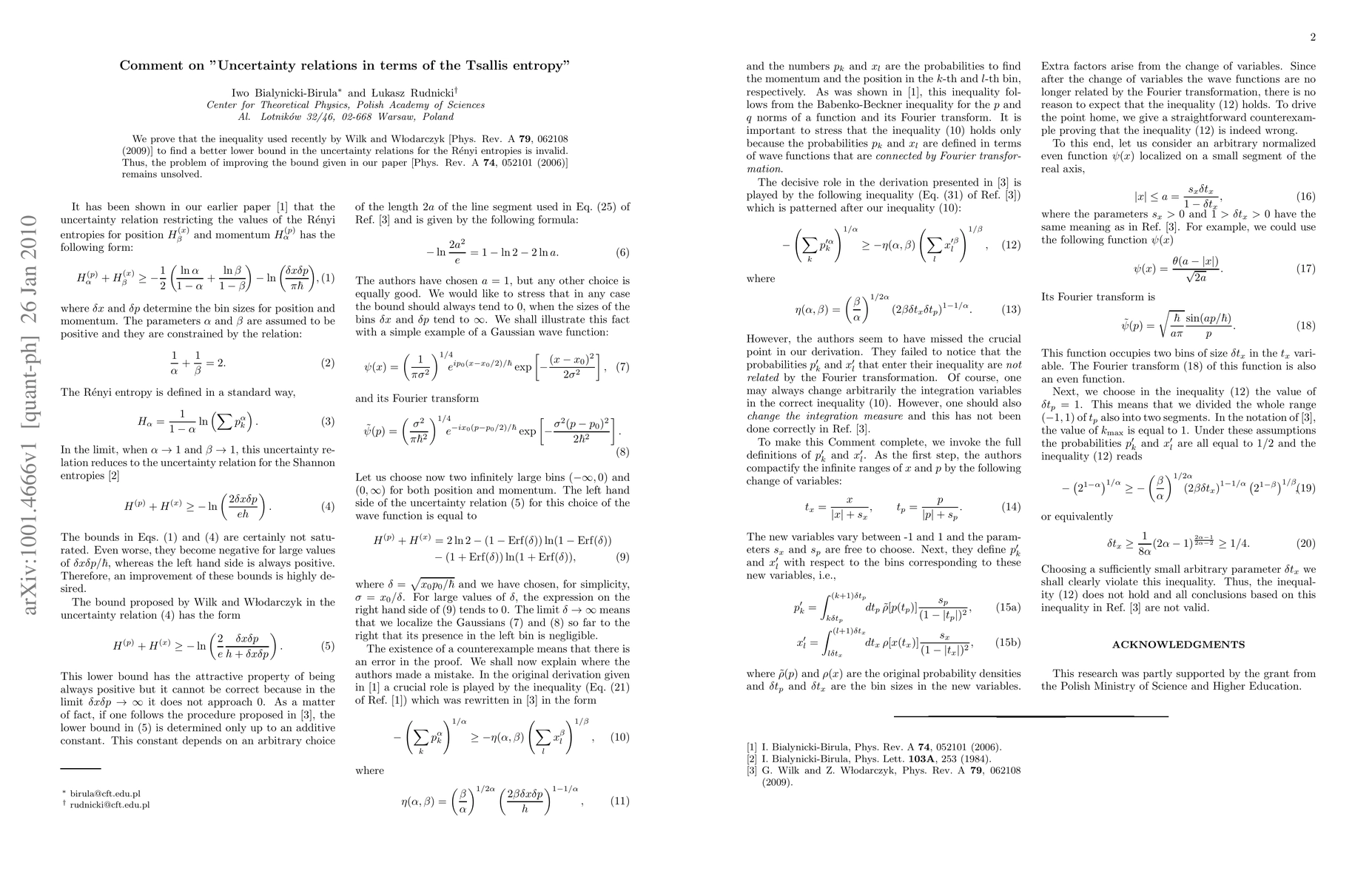 We prove that the inequality used recently by Wilk and W{\l}odarczyk [Phys. Rev. A {\bf 79}, 062108 (2009)] to find a better lower bound in the uncertainty relations for the R\'enyi entropies is invalid. Thus, the problem of improving the bound given in our paper [Phys. Rev. A {\bf 74}, 052101 (2006)] remains unsolved.