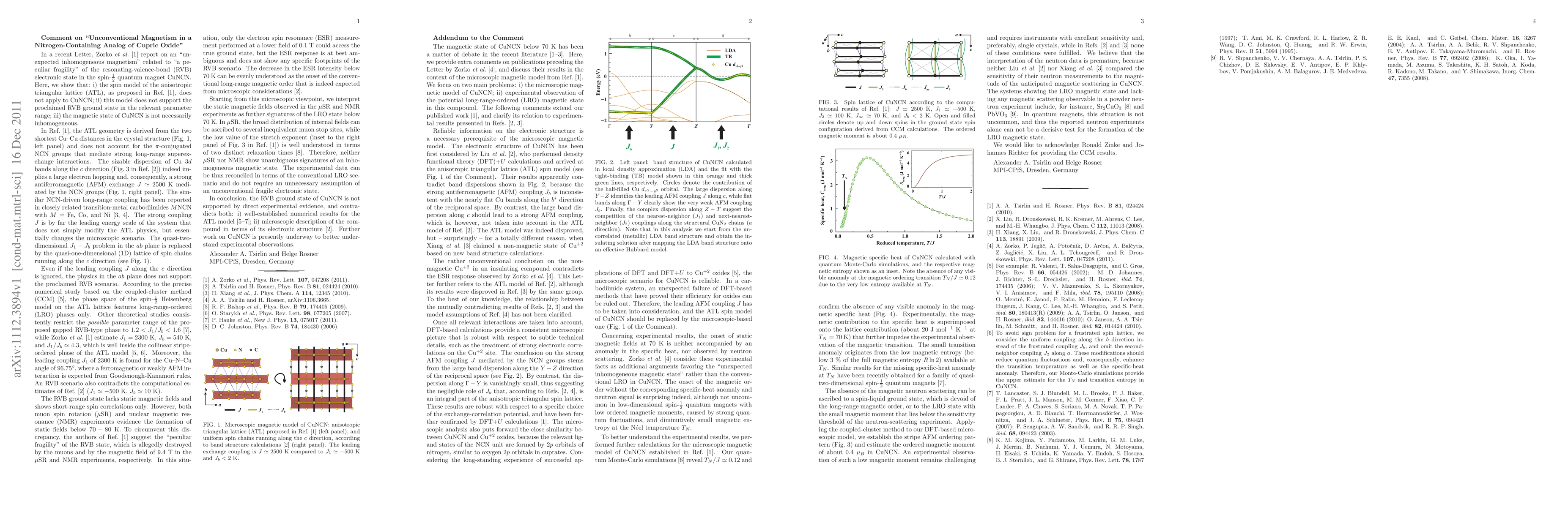 In a recent Letter [PRL, 107, 047208 (2011)], Zorko et al. report on an "unexpected inhomogeneous magnetism" related to "a peculiar fragility" of the resonating-valence-bond (RVB) electronic state in the spin-1/2 quantum magnet CuNCN. Here, we show that: i) the spin model of the anisotropic triangular lattice (ATL), as proposed by Zorko et al., does not apply to CuNCN; ii) this model does not support the proclaimed RVB ground state in the relevant parameter range; iii) the magnetic state of CuNCN is not necessarily inhomogeneous.