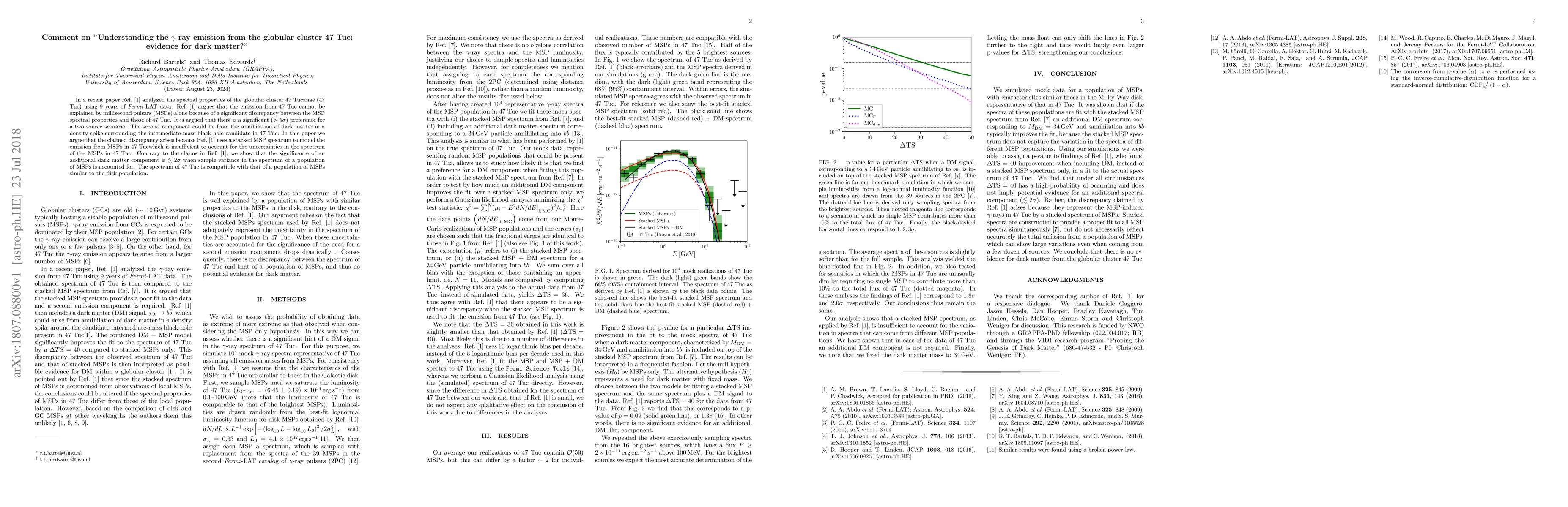 This paper critiques Brown et al.'s (2018) analysis of $\gamma$-ray emission from 47 Tuc, arguing that the claimed discrepancy between observed emission and millisecond pulsars (MSPs) is due to insufficient modeling of MSP spectral uncertainties. The authors conclude that the evidence for a dark matter component is only $\lesssim 2\sigma$, contrary to Brown et al.'s $>5\sigma$ claim.