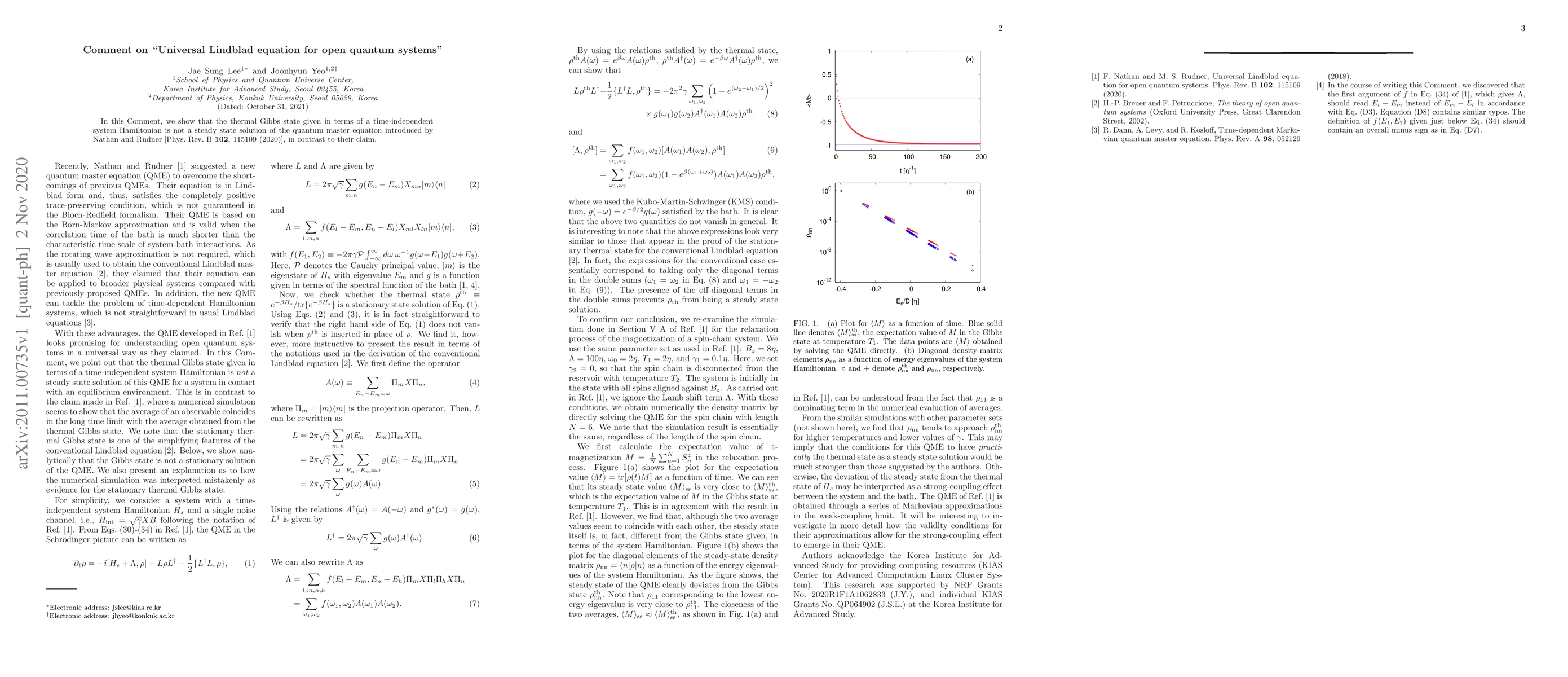 In this Comment, we show that the thermal Gibbs state given in terms of a time-independent system Hamiltonian is not a steady state solution of the quantum master equation introduced by Nathan and Rudner [Phys. Rev. B 102, 115109 (2020)], in contrast to their claim.