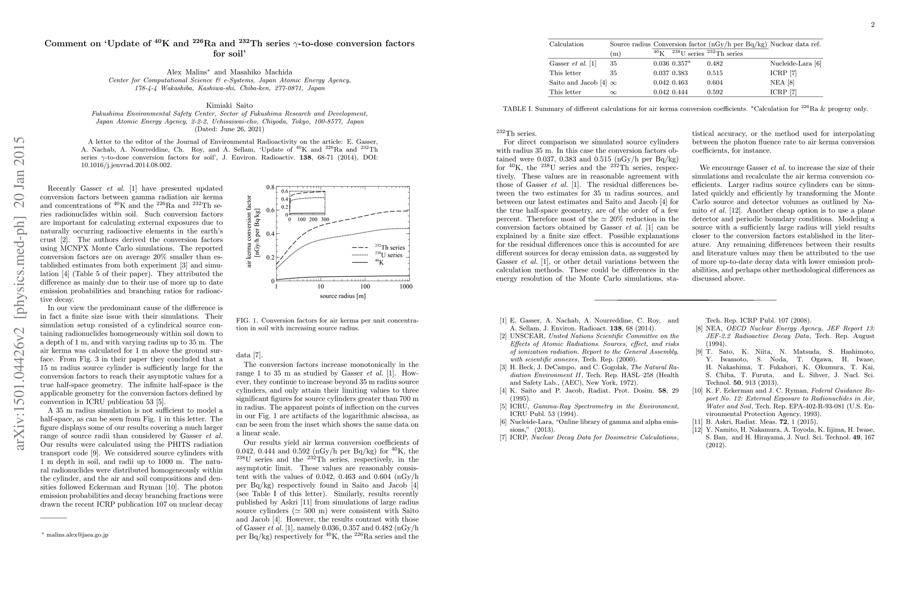 A letter to the editor of the Journal of Environmental Radioactivity on the article: E. Gasser, A. Nachab, A. Nourreddine, Ch. Roy, and A. Sellam, `Update of 40K and 226Ra and 232Th series $\gamma$-to-dose conversion factors for soil', J. Environ. Radioactiv. 138, 68-71 (2014), DOI: 10.1016/j.jenvrad.2014.08.002.