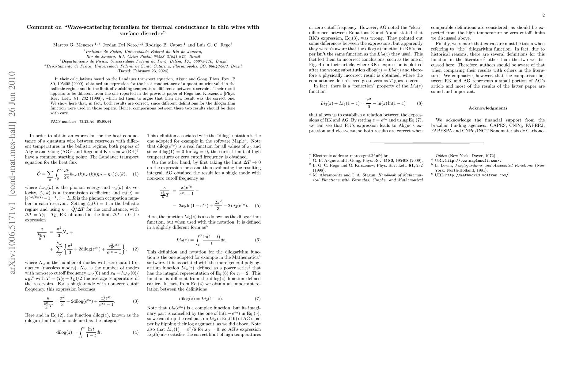 In their calculations based on the Landauer transport equation, Akguc and Gong [Phys. Rev. B 80, 195408 (2009)] obtained an expression for the heat conductance of a quantum wire valid in the ballistic regime and in the limit of vanishing temperature difference between reservoirs. Their result appears to be different from the one reported in the previous paper of Rego and Kirczenow [Phys. Rev. Lett. 81, 232 (1998)], which led them to argue that their new result was the correct one. We show here that, in fact, both results are correct since different definitions for the dilogarithm function were used in those papers. Hence, comparisons between these two results should be done with care.