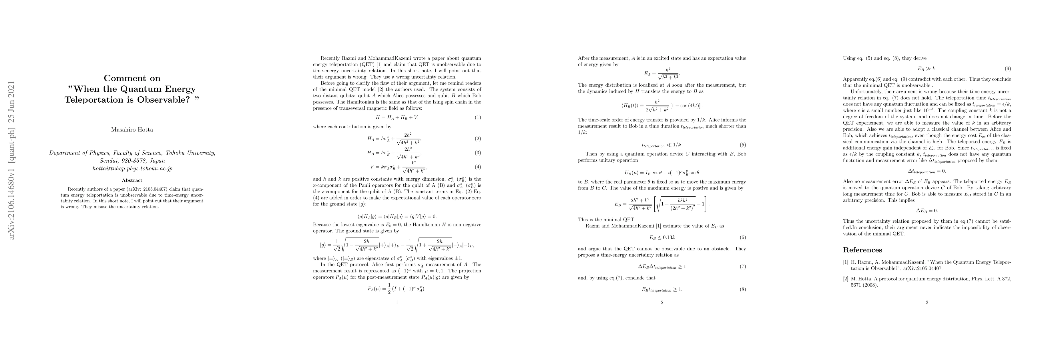 Recently authors of a paper (arXiv:2105.04407) claim that quantum energy teleportation is unobservable due to a time-energy uncertainty relation. In this short note, I will point out that their argument is wrong. They misuse the uncertainty relation.