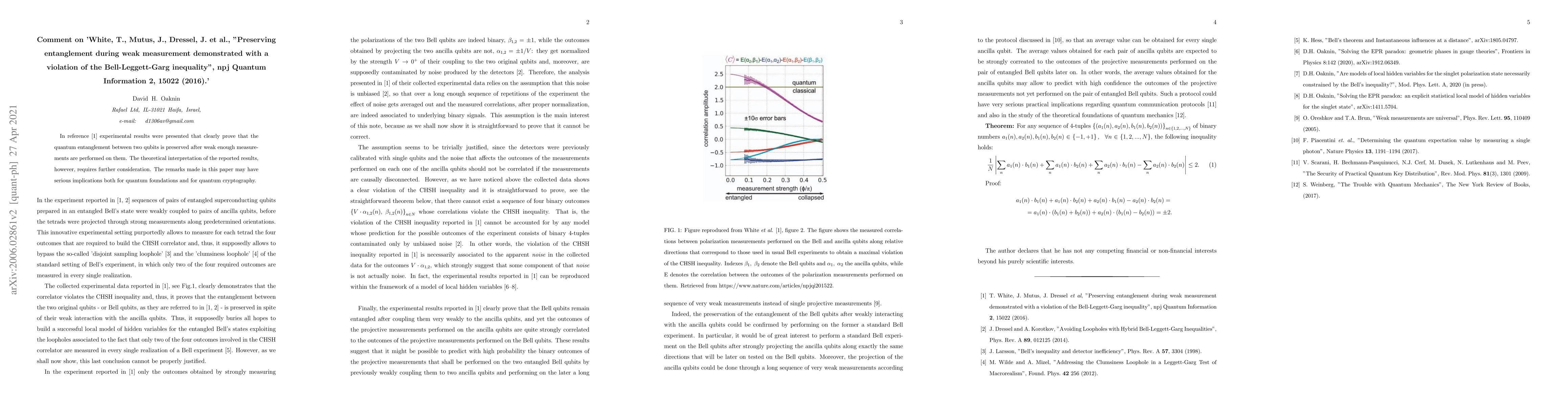 In the cited paper [White, T., Mutus, J., Dressel, J. et al., "Preserving entanglement during weak measurement demonstrated with a violation of the Bell-Leggett-Garg inequality", npj Quantum Information 2, 15022 (2016), arXiv:1504.02707], experimental results were presented that clearly prove that the quantum entanglement between two qubits is preserved after weak enough measurements are performed on them. The theoretical interpretation of the reported results, however, requires further consideration. The remarks made in this paper may have serious implications both for quantum foundations and for quantum cryptography.