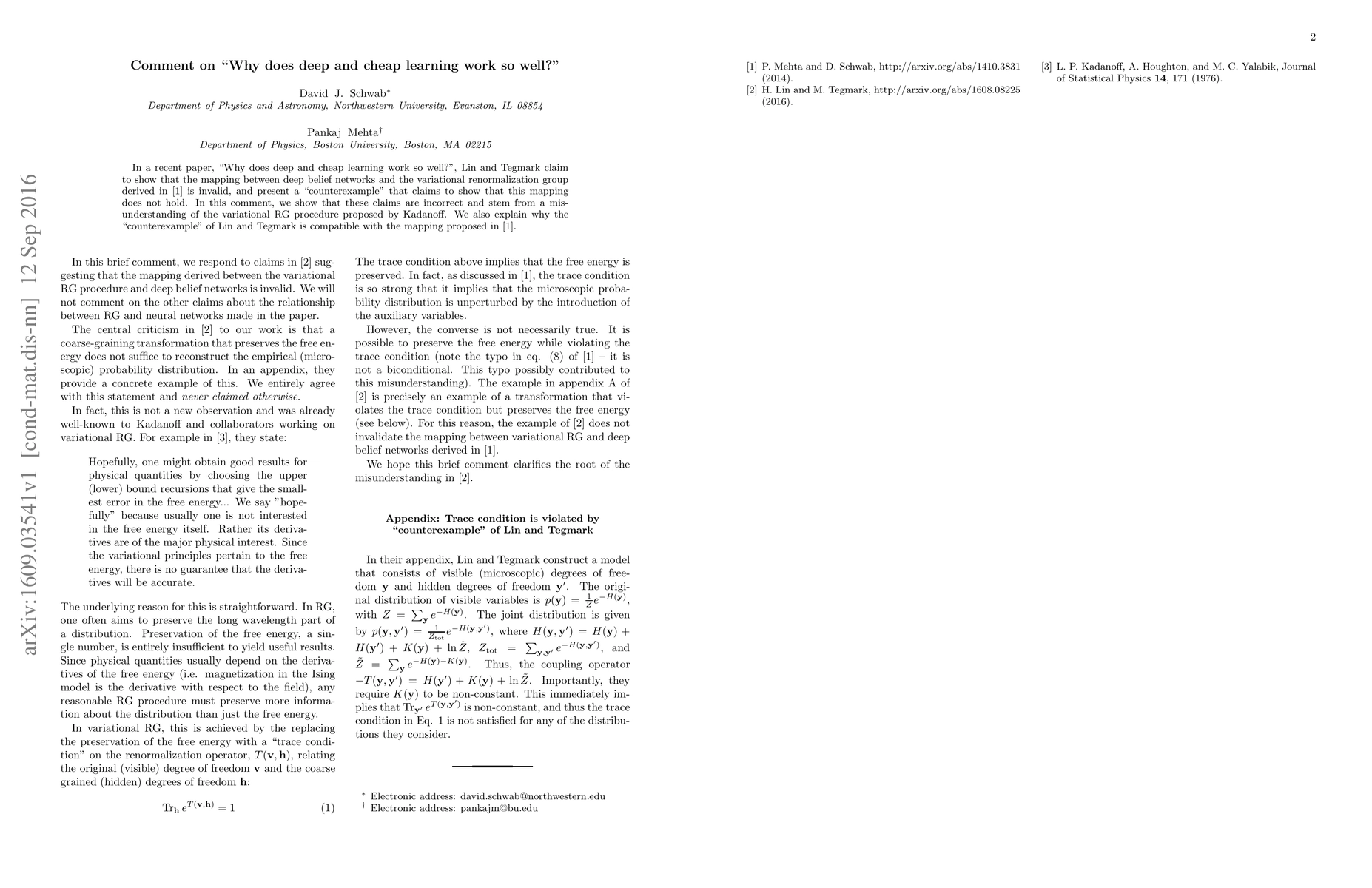In a recent paper, "Why does deep and cheap learning work so well?", Lin and Tegmark claim to show that the mapping between deep belief networks and the variational renormalization group derived in [arXiv:1410.3831] is invalid, and present a "counterexample" that claims to show that this mapping does not hold. In this comment, we show that these claims are incorrect and stem from a misunderstanding of the variational RG procedure proposed by Kadanoff. We also explain why the "counterexample" of Lin and Tegmark is compatible with the mapping proposed in [arXiv:1410.3831].