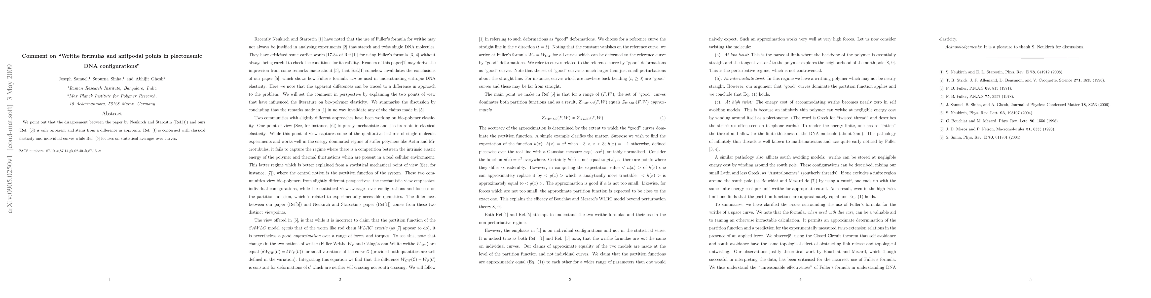 We point out that the disagreement between the paper by Neukirch and Starostin (Ref.[1]) and ours (Ref. [5]) is only apparent and stems from a difference in approach. Ref. [1] is concerned with classical elasticity and individual curves while Ref. [5] focuses on statistical averages over curves.