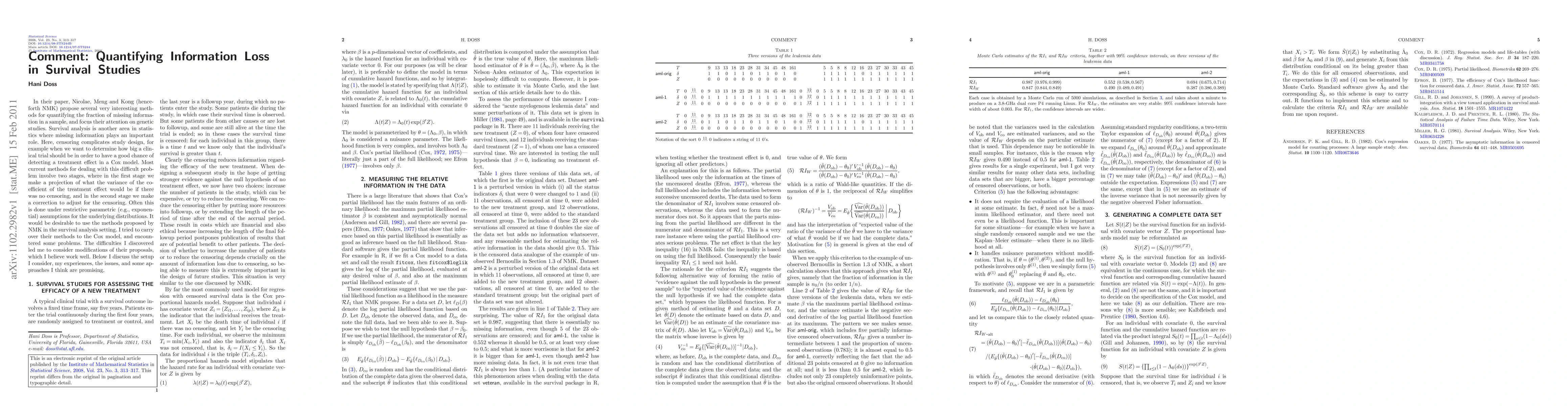 This paper discusses the quantification of information loss in survival studies, particularly focusing on the fraction of missing information for hypothesis testing in statistical and genetic studies. It aims to provide a methodological framework to assess the impact of missing data on survival analysis outcomes.