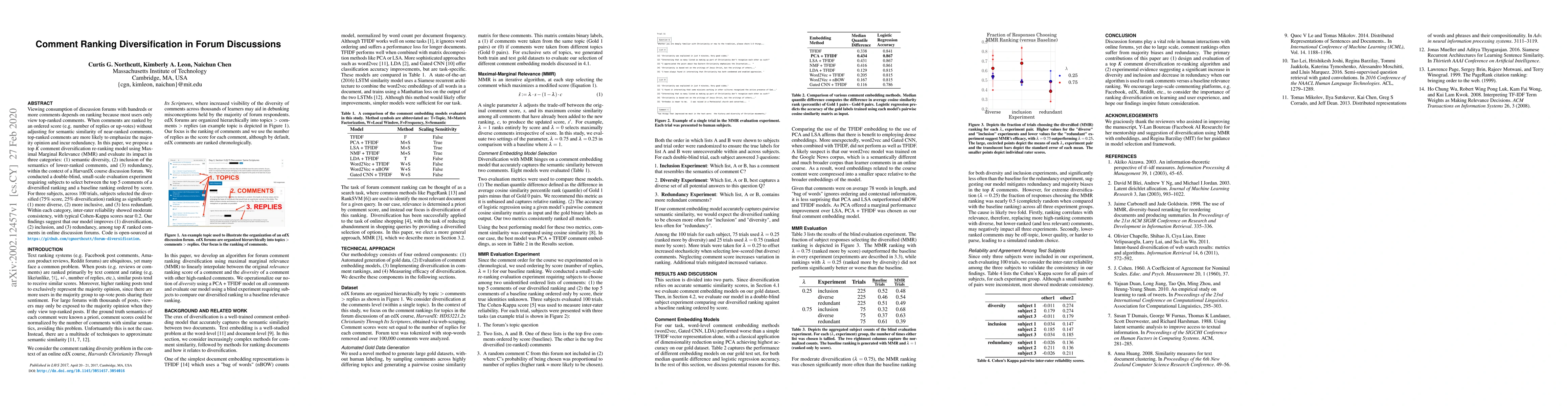 Viewing consumption of discussion forums with hundreds or more comments depends on ranking because most users only view top-ranked comments. When comments are ranked by an ordered score (e.g. number of replies or up-votes) without adjusting for semantic similarity of near-ranked comments, top-ranked comments are more likely to emphasize the majority opinion and incur redundancy. In this paper, we propose a top K comment diversification re-ranking model using Maximal Marginal Relevance (MMR) and evaluate its impact in three categories: (1) semantic diversity, (2) inclusion of the semantics of lower-ranked comments, and (3) redundancy, within the context of a HarvardX course discussion forum. We conducted a double-blind, small-scale evaluation experiment requiring subjects to select between the top 5 comments of a diversified ranking and a baseline ranking ordered by score. For three subjects, across 100 trials, subjects selected the diversified (75% score, 25% diversification) ranking as significantly (1) more diverse, (2) more inclusive, and (3) less redundant. Within each category, inter-rater reliability showed moderate consistency, with typical Cohen-Kappa scores near 0.2. Our findings suggest that our model improves (1) diversification, (2) inclusion, and (3) redundancy, among top K ranked comments in online discussion forums.