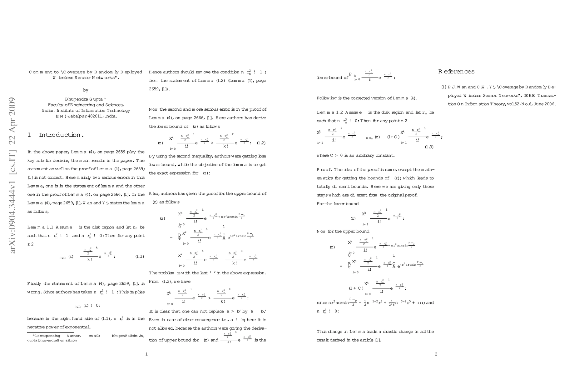 This research correction is important because it affects the accuracy of results in coverage by randomly deployed wireless sensor networks.