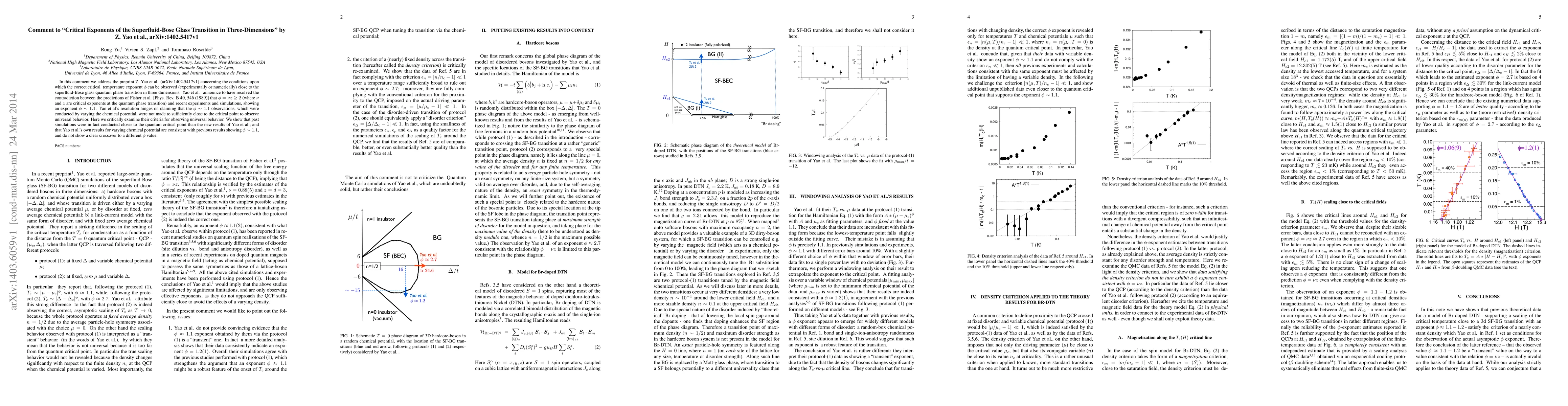 In this comment we address the preprint Z. Yao et al. (arXiv:1402.5417v1) concerning the conditions upon which the correct critical temperature exponent $\phi$ can be observed (experimentally or numerically) close to the superfluid-Bose glass quantum phase transition in three dimensions. Yao et al. announce to have resolved the contradiction between the predictions of Fisher et al. [Phys. Rev. B 40, 546 (1989)] that $\phi = \nu z \geq 2$ (where $\nu$ and $z$ are critical exponents at the quantum phase transition) and recent experiments and simulations, showing an exponent $\phi \sim 1.1$. Yao et al's resolution hinges on claiming that the $\phi \sim 1.1$ observations, which were conducted by varying the chemical potential, were not made to sufficiently close to the critical point to observe universal behavior. Here we critically examine their criteria for observing universal behavior. We show that past simulations were in fact conducted closer to the quantum critical point than the new results of Yao et al.; and that Yao et al.'s own results for varying chemical potential are consistent with previous results showing $\phi \sim 1.1$, and do not show a clear crossover to a different $\phi$ value.