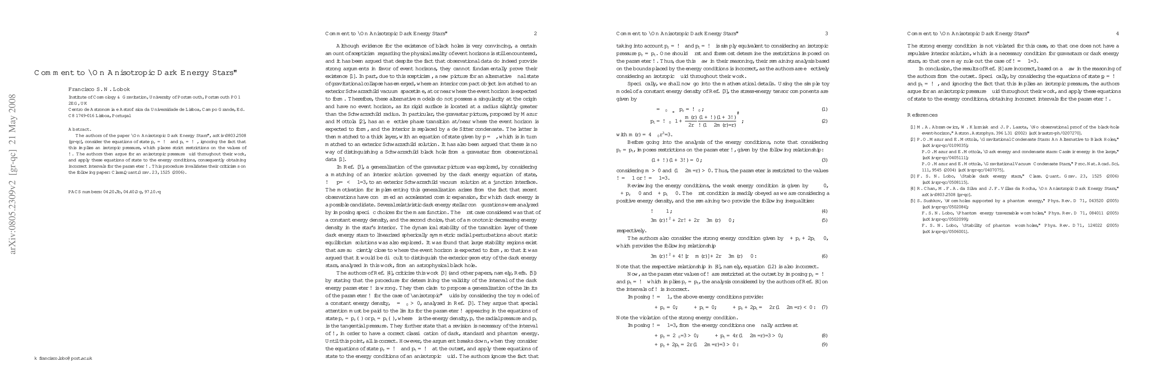 The authors of the paper ''On Anisotropic Dark Energy Stars'', arXiv:0803.2508 [gr-qc], consider the equations of state $p_r=\omega \rho$ and $p_t=\omega \rho$, ignoring the fact that this implies an isotropic pressure, which places strict restrictions on the values of $\omega$. The authors then argue for an anisotropic pressure fluid throughout their work, and apply these equations of state to the energy conditions, consequently obtaining incorrect intervals for the parameter $\omega$. This procedure invalidates their criticisms on the following paper: Class.Quant.Grav. 23, 1525 (2006).
