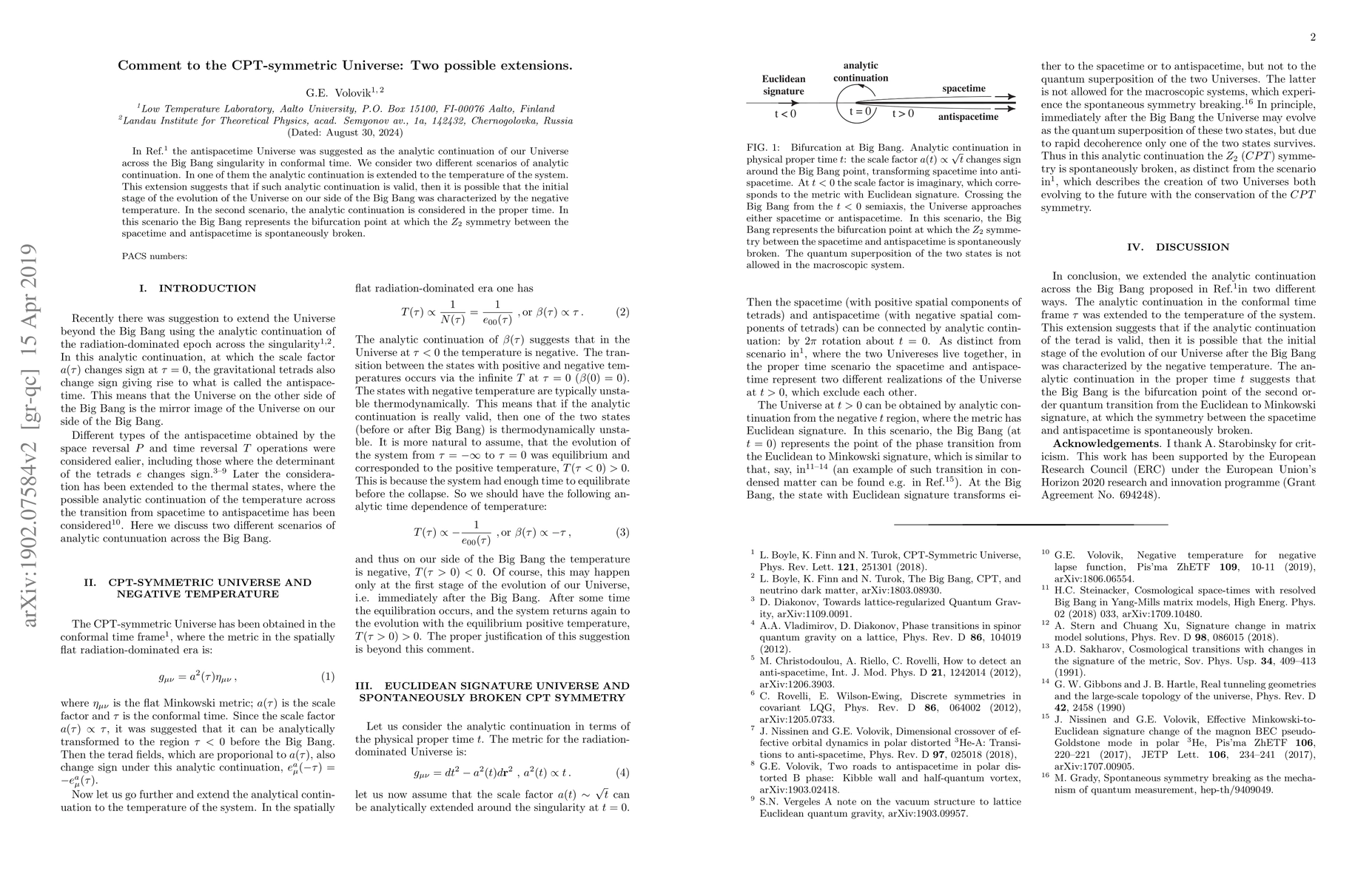 In Ref.1 (L. Boyle, K. Finn and N. Turok, CPT-Symmetric Universe, Phys. Rev. Lett. {\bf 121}, 251301 (2018)) the antispacetime Universe was suggested as the analytic continuation of our Universe across the Big Bang singularity in conformal time. We consider two different scenarios of analytic continuation. In one of them the analytic continuation is extended to the temperature of the system. This extension suggests that if such analytic continuation is valid, then it is possible that the initial stage of the evolution of the Universe on our side of the Big Bang was characterized by the negative temperature. In the second scenario, the analytic continuation is considered in the proper time. In this scenario the Big Bang represents the bifurcation point at which the $Z_2$ symmetry between the spacetime and antispacetime is spontaneously broken.