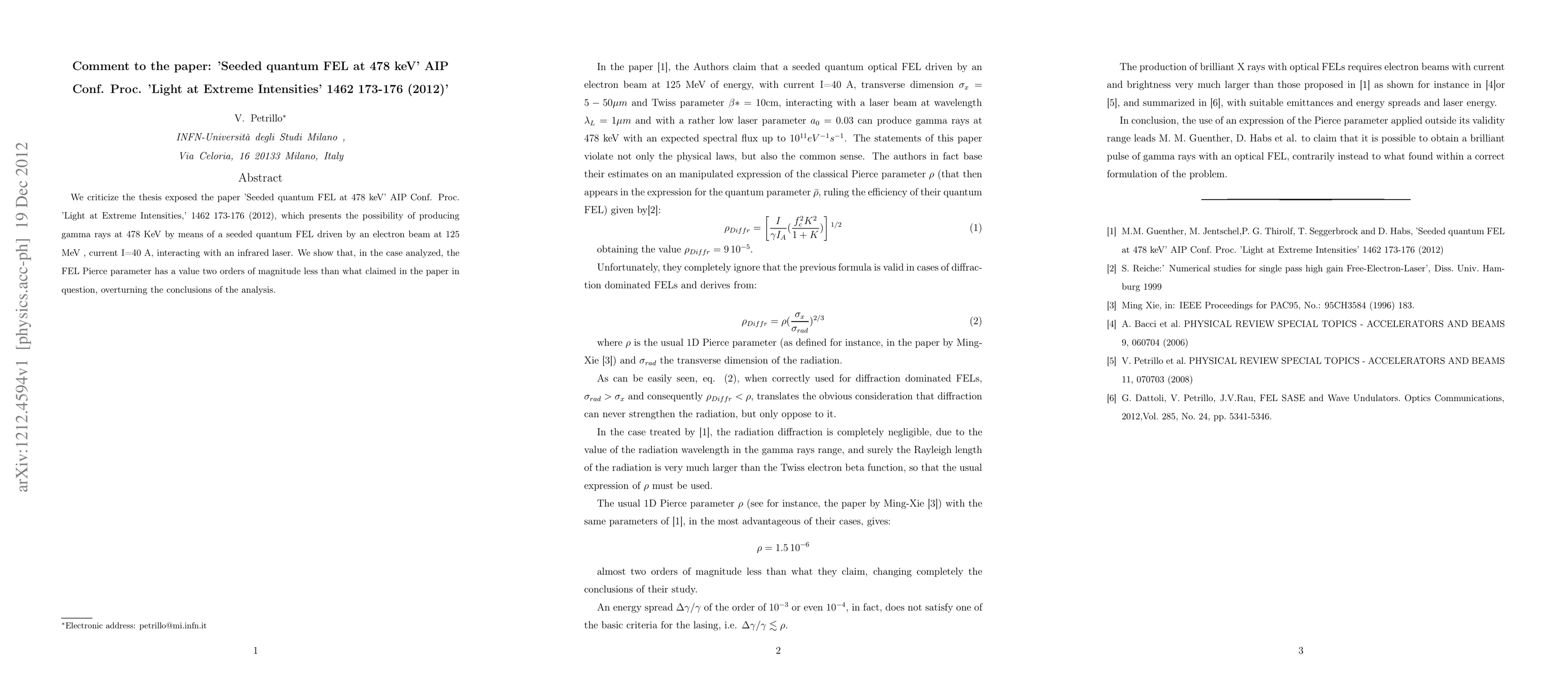 We criticize the thesis exposed the paper 'Seeded quantum FEL at 478 keV' AIP Conf. Proc. 'Light at Extreme Intensities,' 1462 173-176 (2012), which presents the possibility of producing gamma rays at 478 KeV by means of a seeded quantum FEL driven by an electron beam at 125 MeV, current I=40 A, interacting with an infrared laser. We show that, in the case analyzed, the FEL Pierce parameter has a value two orders of magnitude less than what claimed in the paper in question, overturning the conclusions of the analysis.