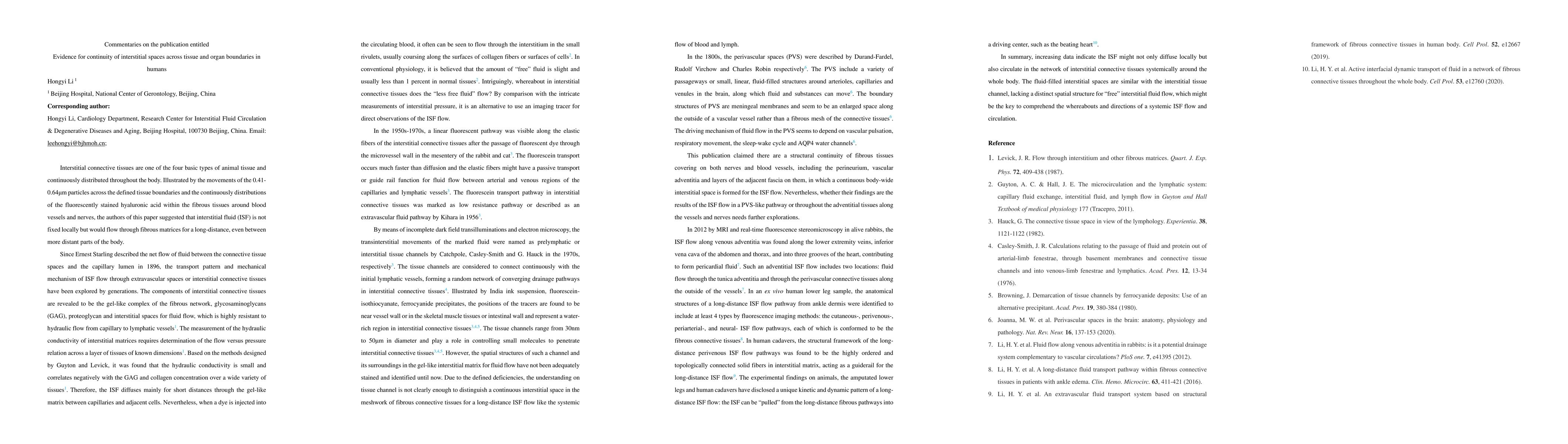 Interstitial connective tissues are one of the four basic types of animal tissue and continuously distributed throughout the body. Illustrated by the movements of the micron-sized particles across the defined tissue boundaries and the continuously distributions of the fluorescently stained hyaluronic acid within the fibrous tissues around blood vessels and nerves, the authors of this paper suggested that interstitial fluid (ISF) is not fixed locally but would flow through fibrous matrices for a long-distance, even between more distant parts of the body. However,the fluid-filled interstitial spaces are similar with the interstitial tissue channel, lacking a distinct spatial structure for "free" interstitial fluid flow, which might be the key to comprehend the whereabouts and directions of a systemic fluid flow and circulation.