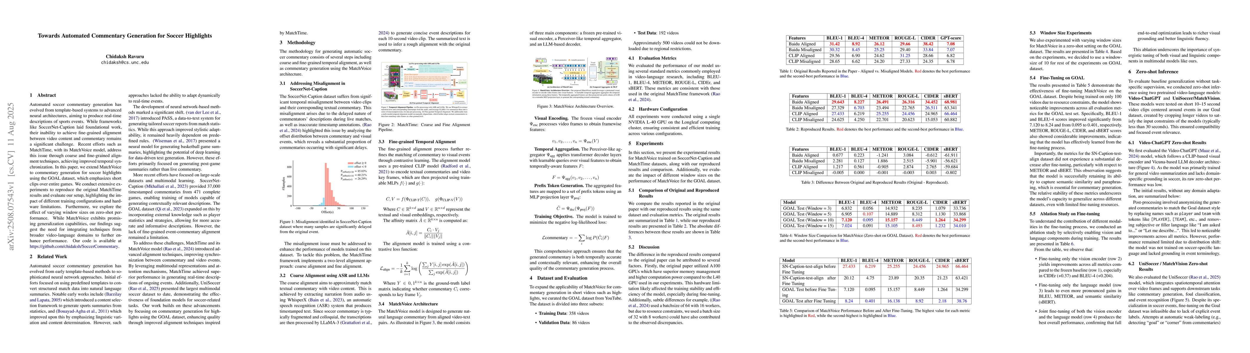 Automated soccer commentary generation has evolved from template-based systems to advanced neural architectures, aiming to produce real-time descriptions of sports events. While frameworks like SoccerNet-Caption laid foundational work, their inability to achieve fine-grained alignment between video content and commentary remains a significant challenge. Recent efforts such as MatchTime, with its MatchVoice model, address this issue through coarse and fine-grained alignment techniques, achieving improved temporal synchronization. In this paper, we extend MatchVoice to commentary generation for soccer highlights using the GOAL dataset, which emphasizes short clips over entire games. We conduct extensive experiments to reproduce the original MatchTime results and evaluate our setup, highlighting the impact of different training configurations and hardware limitations. Furthermore, we explore the effect of varying window sizes on zero-shot performance. While MatchVoice exhibits promising generalization capabilities, our findings suggest the need for integrating techniques from broader video-language domains to further enhance performance. Our code is available at https://github.com/chidaksh/SoccerCommentary.