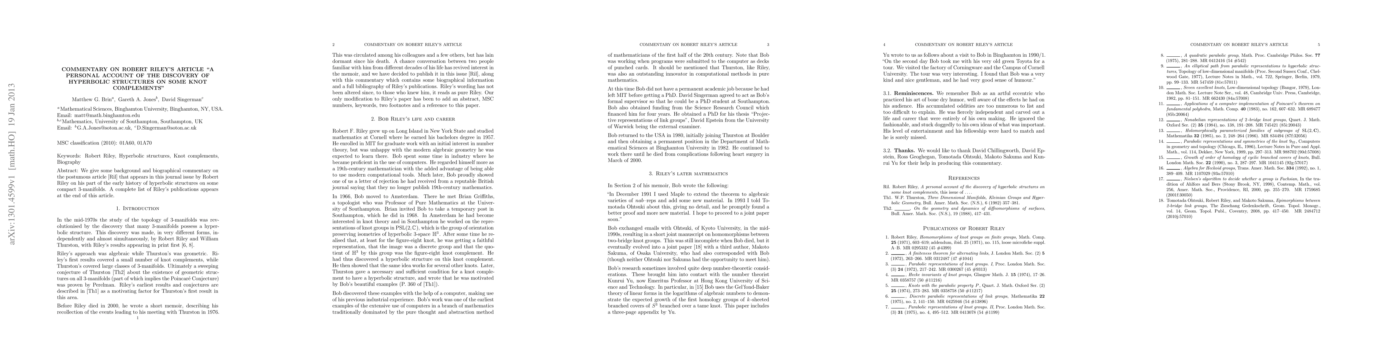 We give some background and biographical commentary on the postumous article that appears in this [journal issue | ArXiv] by Robert Riley on his part of the early history of hyperbolic structures on some compact 3-manifolds. A complete list of Riley's publications appears at the end of the article.