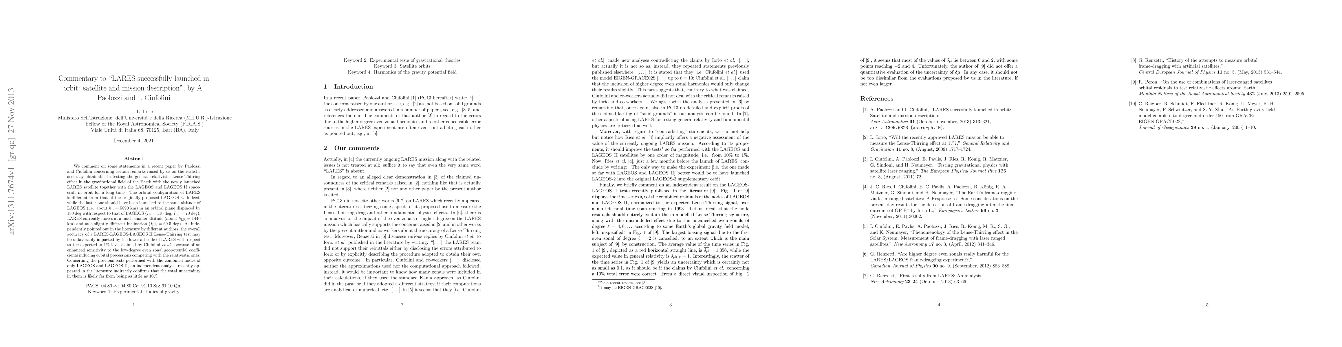 This commentary discusses discrepancies in the orbital configuration and accuracy of LARES satellite compared to the originally proposed LAGEOS-3, questioning the claimed $1\%$ accuracy in testing the general relativistic Lense-Thirring effect due to LARES's lower altitude and its impact on orbital precessions. It also highlights uncertainties in previous tests using LAGEOS and LAGEOS II.