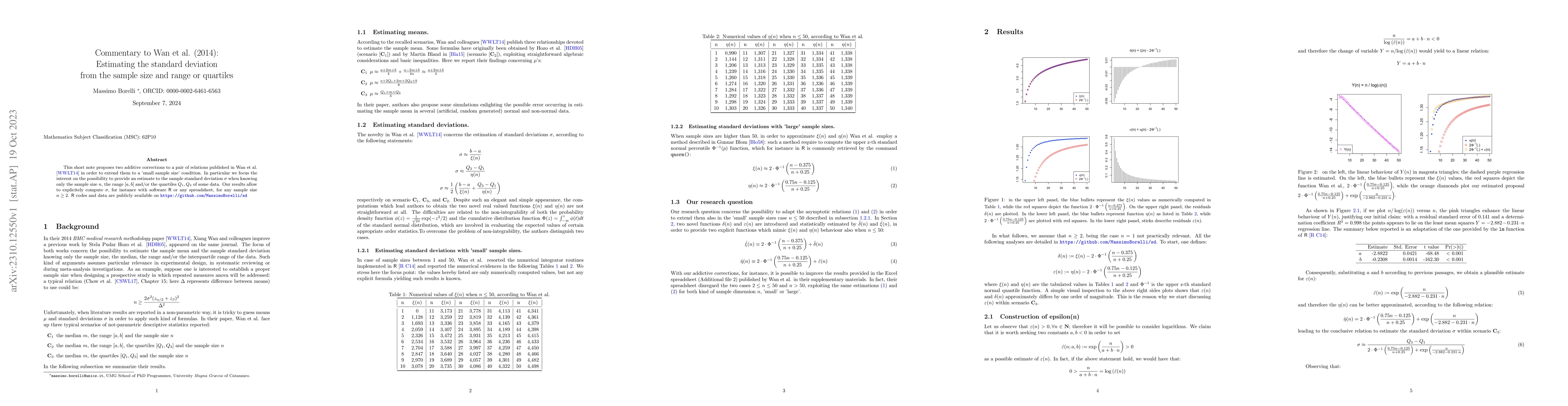 This short note proposes two additive corrections to a pair of relations published in Wan et al. in order to extend them to a small sample size condition. In particular we focus the interest on the possibility to provide an estimate to the sample standard deviation when knowing only the sample size, the range and/or the quartiles. Our results allow to explicitely compute standard deviation, for instance with software R or any spreadsheet, for any sample size grater than 2. R codes and data are publicly available.