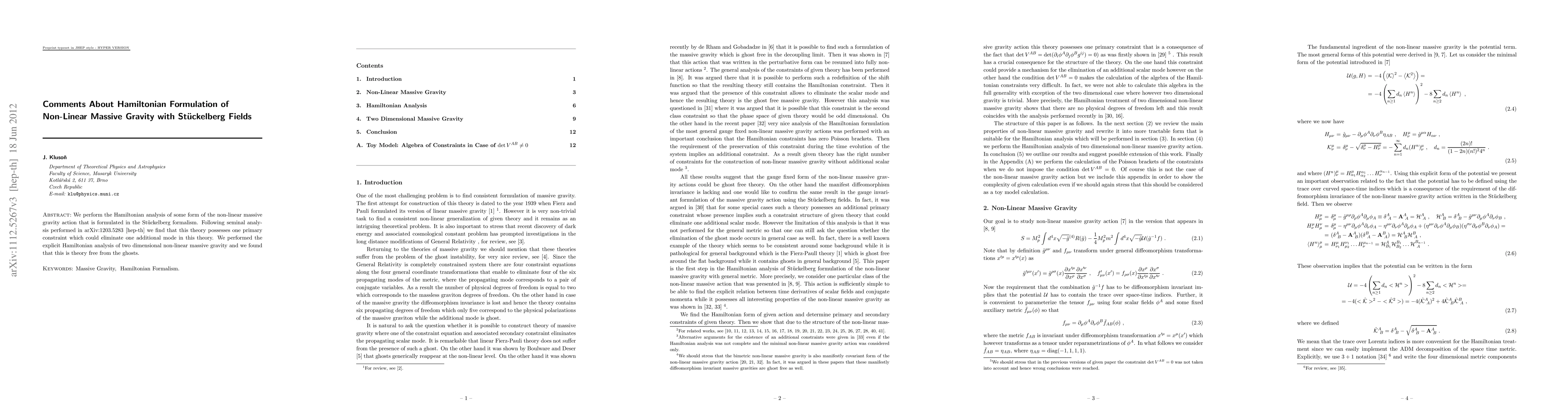 We perform the Hamiltonian analysis of some form of the non-linear massive gravity action that is formulated in the Stuckelberg formalism. Following seminal analysis performed in arXiv:1203.5283 [hep-th] we find that this theory possesses one primary constraint which could eliminate one additional mode in this theory. We performed the explicit Hamiltonian analysis of two dimensional non-linear massive gravity and we found that this is theory free from the ghosts.