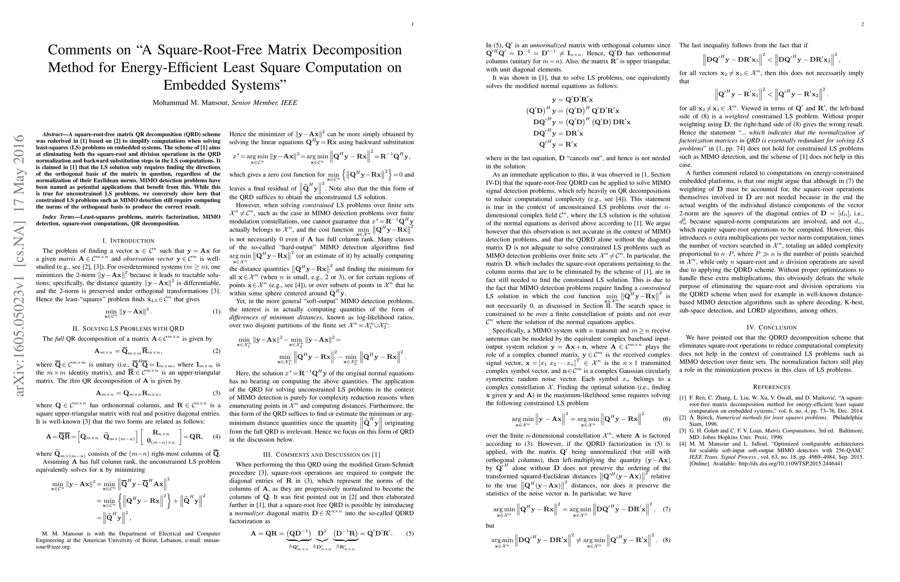 A square-root-free matrix QR decomposition (QRD) scheme was rederived in [1] based on [2] to simplify computations when solving least-squares (LS) problems on embedded systems. The scheme of [1] aims at eliminating both the square-root and division operations in the QRD normalization and backward substitution steps in the LS computations. It is claimed in [1] that the LS solution only requires finding the directions of the orthogonal basis of the matrix in question, regardless of the normalization of their Euclidean norms. MIMO detection problems have been named as potential applications that benefit from this. While this is true for unconstrained LS problems, we conversely show here that constrained LS problems such as MIMO detection still require computing the norms of the orthogonal basis to produce the correct result.