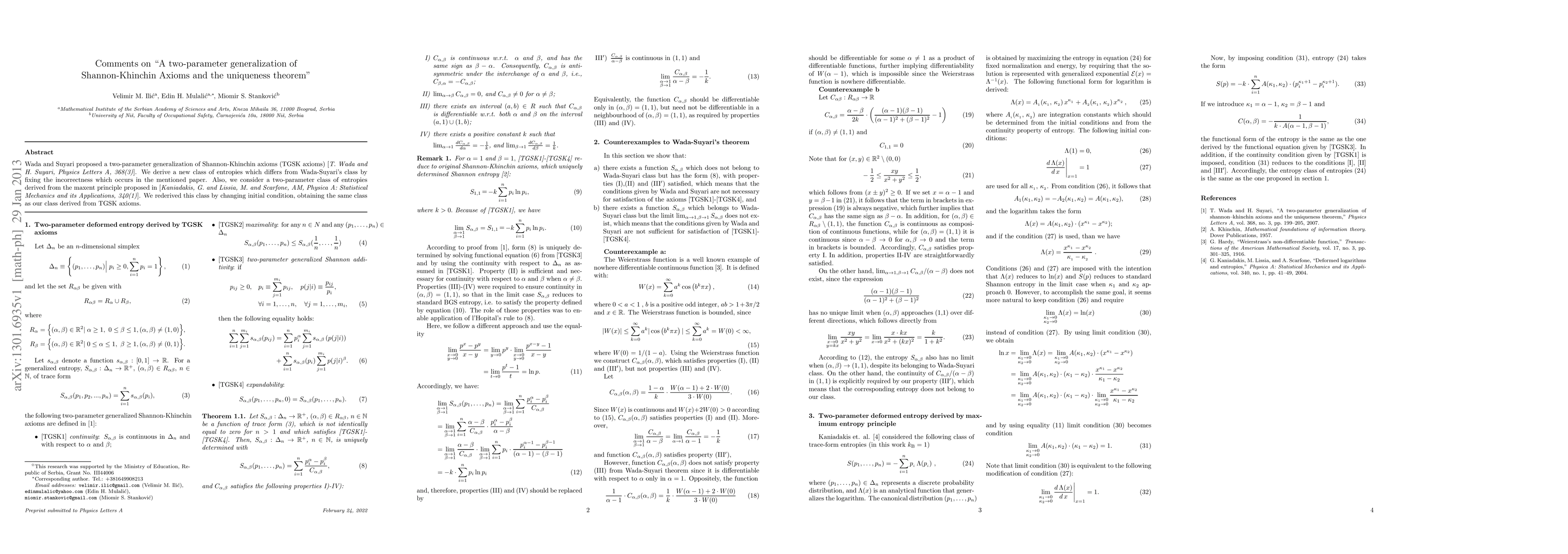 Wada and Suyari proposed a two-parameter generalization of Shannon-Khinchin axioms (TGSK axioms) [T. Wada and H. Suyari, Physics Letters A, 368(3)]. We derive a new class of entropies which differs from Wada-Suyari's class by fixing the incorrectness which occurs in the mentioned paper. Also, we consider a two-parameter class of entropies derived from the maxent principle proposed in [Kaniadakis, G. and Lissia, M. and Scarfone, AM, Physica A: Statistical Mechanics and its Applications, 340(1)]. We rederived this class by changing initial condition, obtaining the same class as our class derived from TGSK axioms.