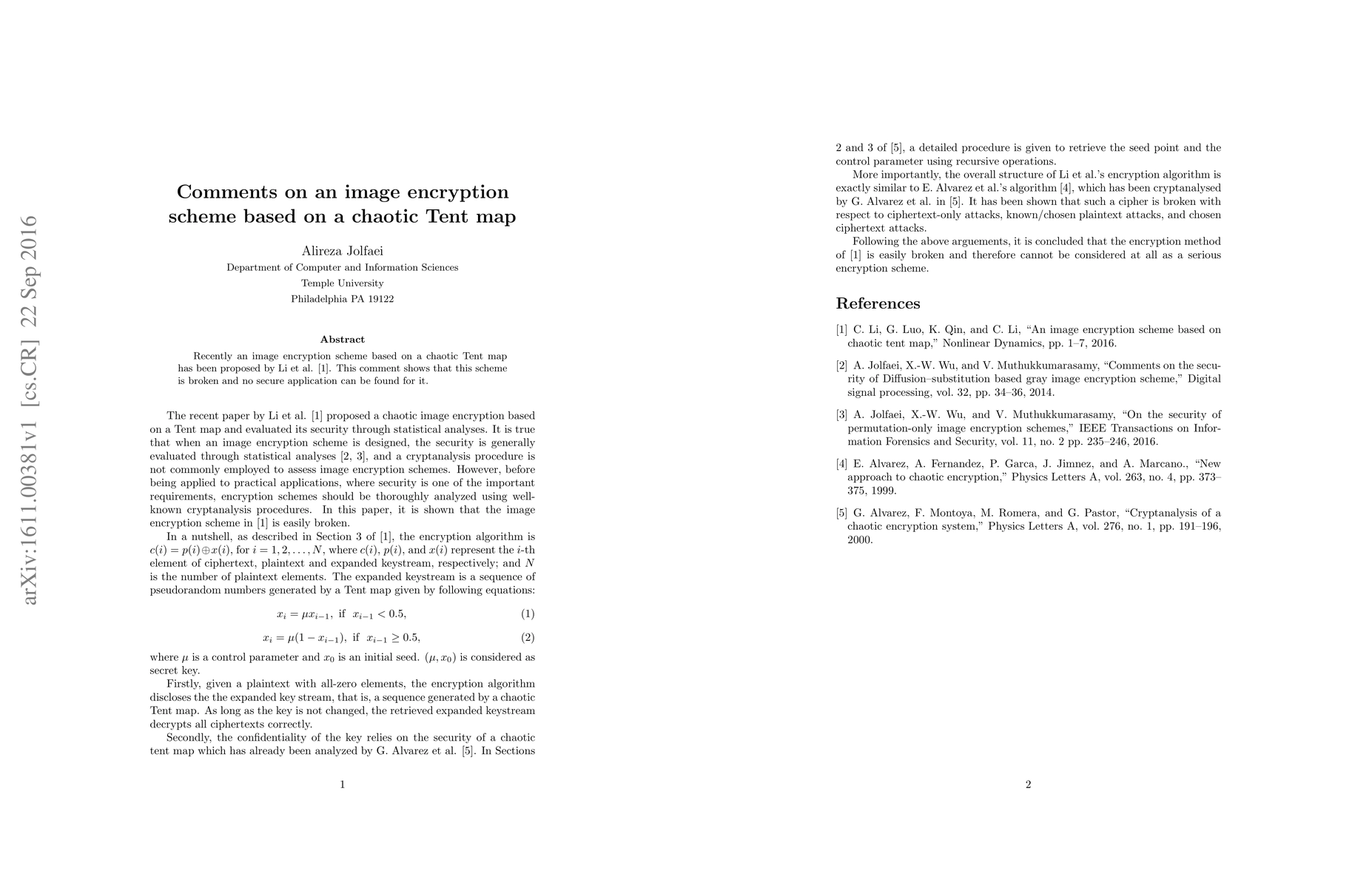 Summary: This paper critiques a recently proposed image encryption scheme based on a chaotic Tent map by Li et al., demonstrating its vulnerabilities and concluding that it cannot be securely applied.