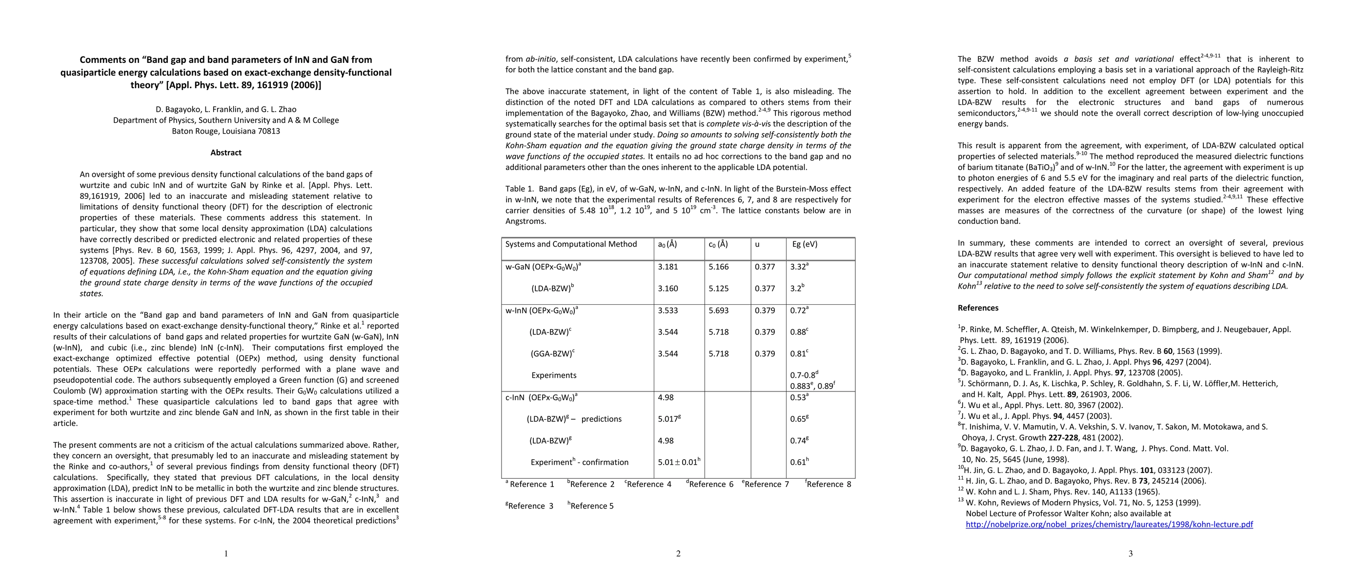 An oversight of some previous density functional calculations of the band gaps of wurtzite and cubic InN and of wurtzite GaN by Rinke et al. [Appl. Phys. Lett. 89,161919, 2006] led to an inaccurate and misleading statement relative to limitations of density functional theory (DFT) for the description of electronic properties of these materials. These comments address this statement. In particular, they show that some local density approximation (LDA) calculations have correctly described or predicted electronic and related properties of these systems [Phys. Rev. B 60, 1563, 1999; J. Appl. Phys. 96, 4297, 2004, and 97, 123708, 2005]. These successful calculations solved self-consistently the system of equations defining LDA, i.e., the Kohn-Sham equation and the equation giving the ground state charge density in terms of the wave functions of the occupied states.