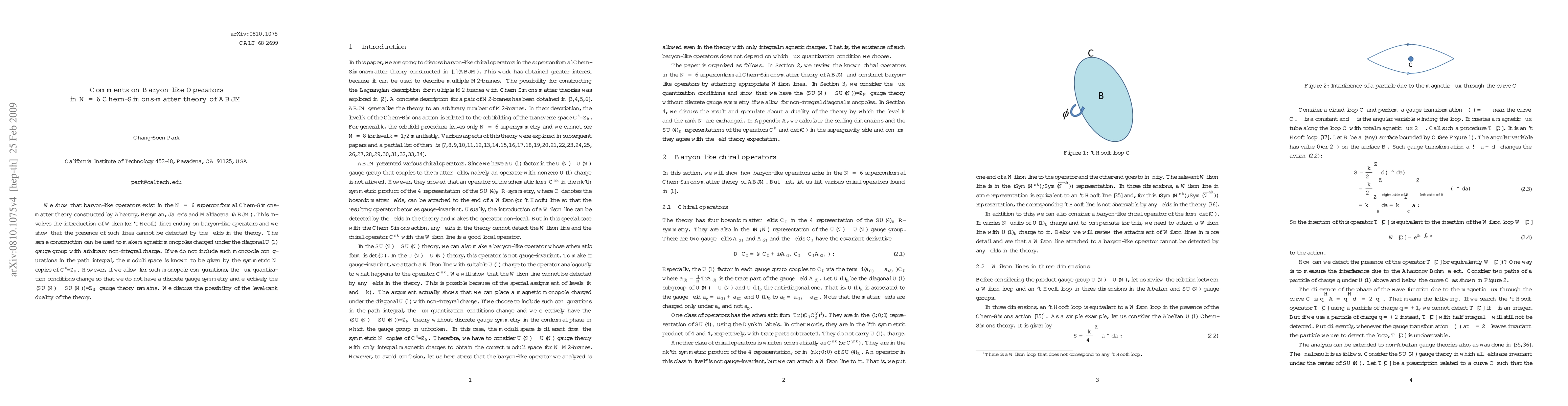 We show that baryon-like operators exist in the N=6 superconformal Chern-Simons-matter theory constructed by Aharony, Bergman, Jafferis and Maldacena (ABJM). This involves the introduction of Wilson(or 't Hooft) lines ending on baryon-like operators and we show that the presence of such lines cannot be detected by the fields in the theory. The same construction can be used to make magnetic monopoles charged under the diagonal U(1) gauge group with arbitrary non-integral charge. If we do not include such monopole configurations in the path integral, the moduli space is known to be given by the symmetric N copies of C^4/Z_k. However, if we allow for such monopole configurations, the flux quantization conditions change so that we do not have a discrete gauge symmetry and effectively the (SU(N)xSU(N))/Z_N gauge theory remains. We discuss the possibility of the level-rank duality of the theory.