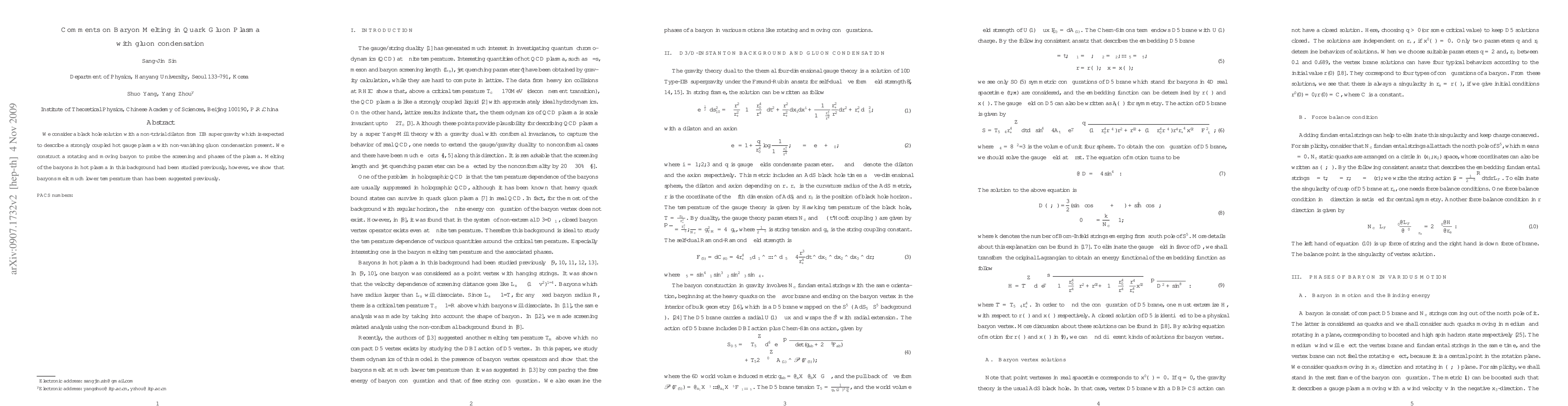 We consider a black hole solution with a non-trivial dilaton from IIB super gravity which is expected to describe a strongly coupled hot gauge plasma with non-vanishing gluon condensation present. We construct a rotating and moving baryon to probe the screening and phases of the plasma. Melting of the baryons in hot plasma in this background had been studied previously, however, we show that baryons melt much lower temperature than has been suggested previously.