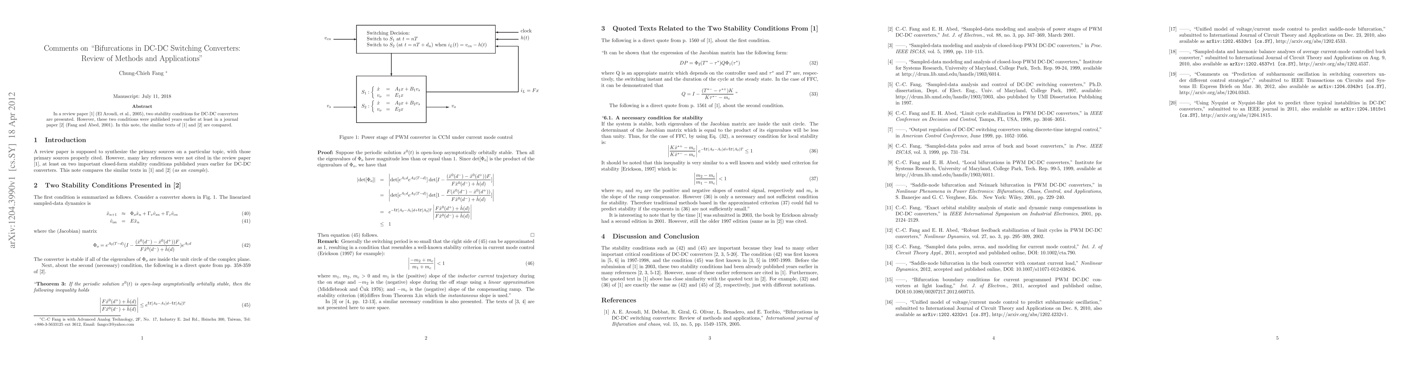 In a review paper [1] (El Aroudi, et al., 2005), two stability conditions for DC-DC converters are presented. However, these two conditions were published years earlier at least in a journal paper [2] (Fang and Abed, 2001). In this note, the similar texts of [1] and [2] are compared.