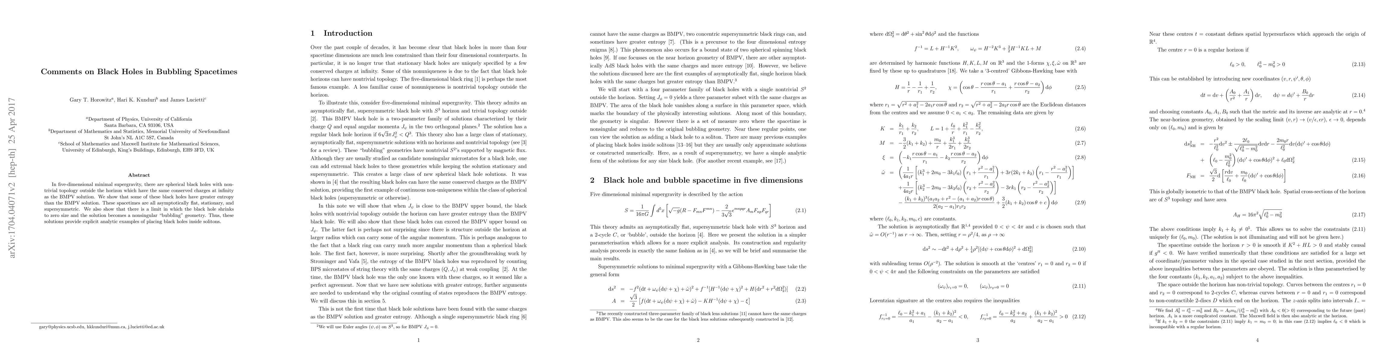 This paper discusses five-dimensional minimal supergravity spherical black holes with complex topologies outside the horizon, revealing that some possess higher entropy than the BMPV solution. It also explores a limit where these black holes shrink to zero size, resulting in a nonsingular "bubbling" geometry, providing analytic examples of black holes within solitons.