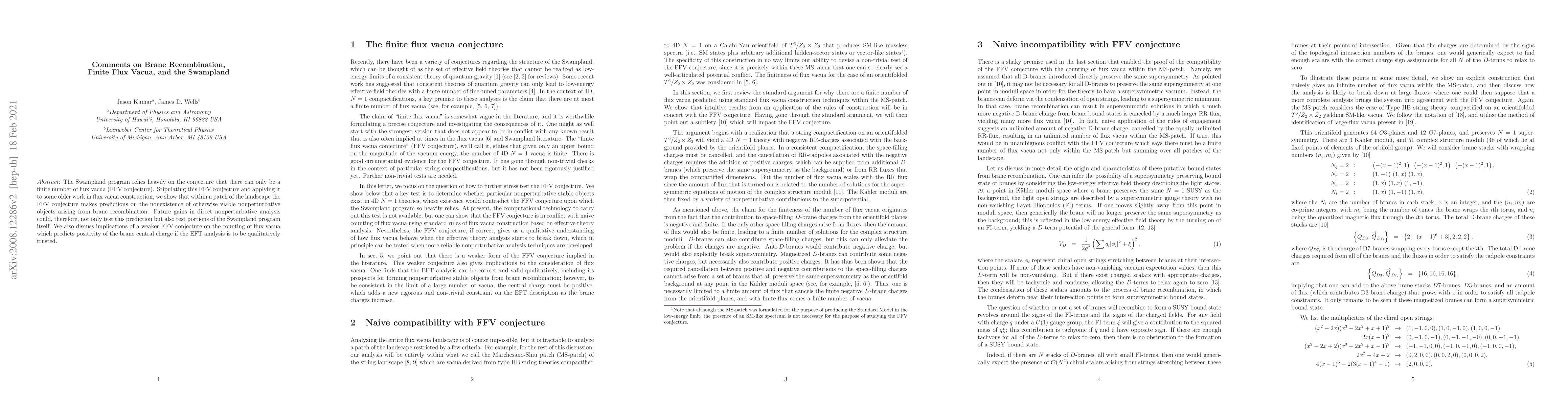 This paper explores the Swampland conjecture's finite flux vacua (FFV) hypothesis, showing that it predicts the non-existence of brane recombination outcomes within the landscape. It suggests that future non-perturbative analysis could validate this conjecture and parts of the Swampland program, while also discussing the implications of a weaker FFV conjecture on brane central charge positivity.
