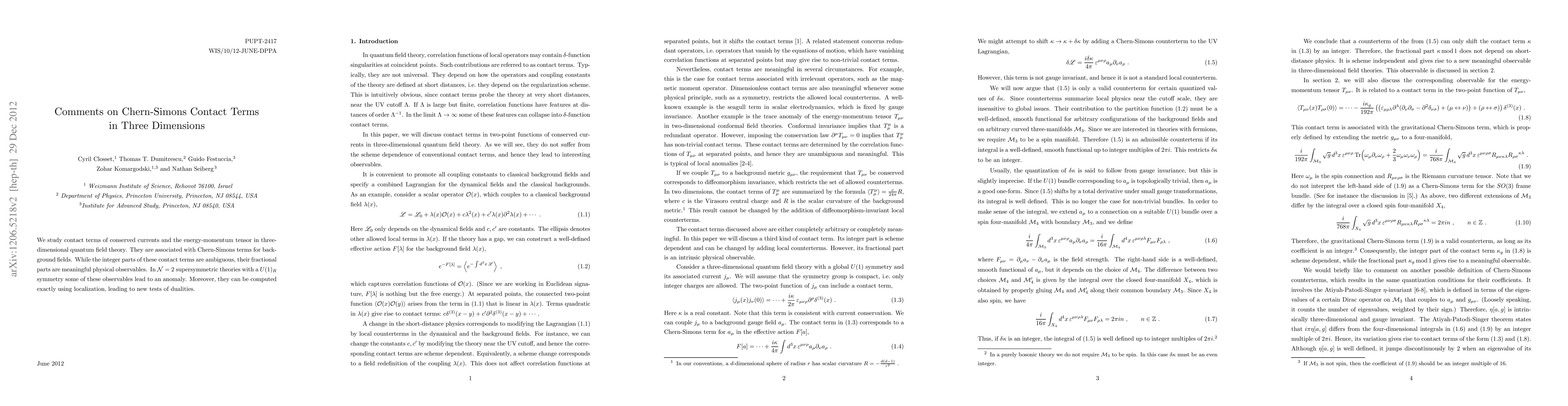 This paper investigates the contact terms of conserved currents and the energy-momentum tensor in three-dimensional quantum field theory, linking them to Chern-Simons terms. It highlights that while integer parts of these contact terms are ambiguous, fractional parts are meaningful physical observables, particularly in N=2 supersymmetric theories with U(1)_R symmetry, where they can reveal anomalies and be computed exactly via localization.