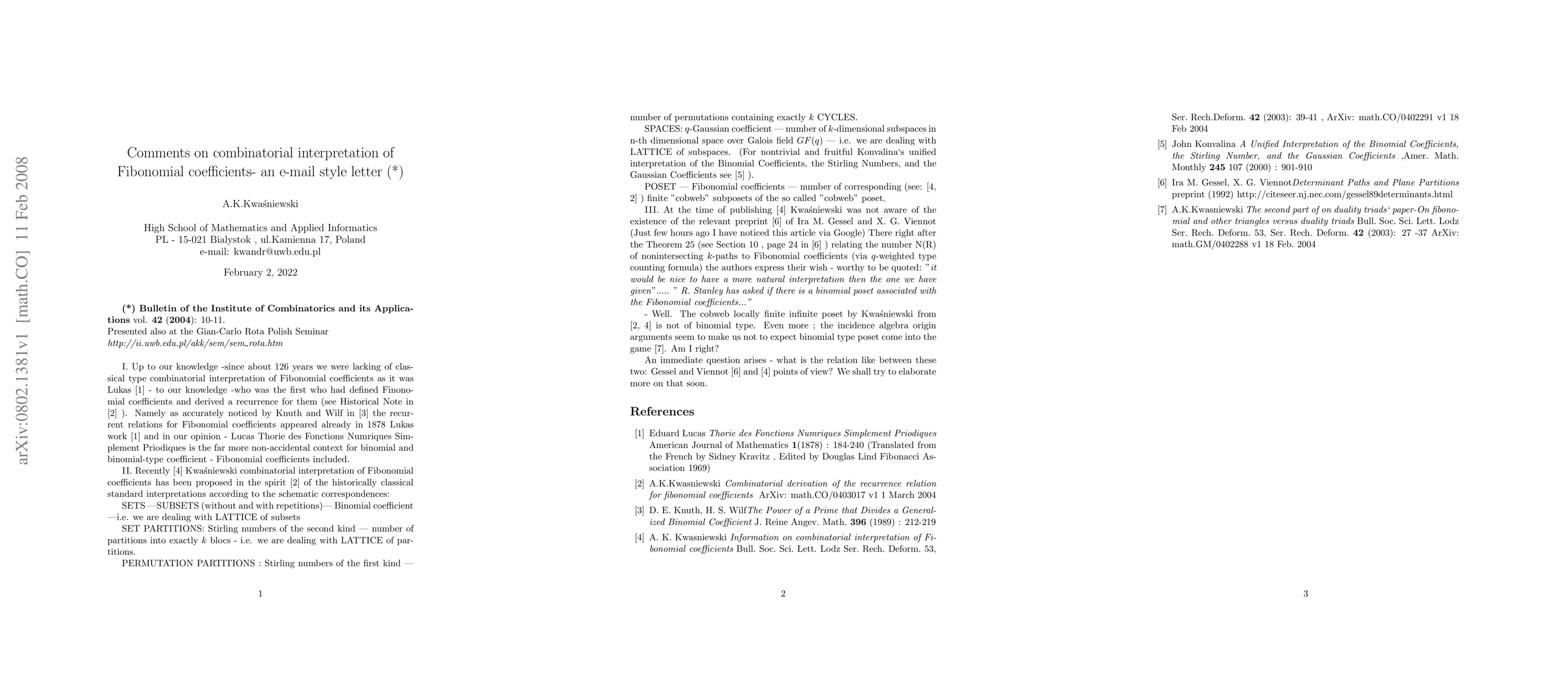 Up to our knowledge -since about 126 years we were lacking of classical type combinatorial interpretation of Fibonomial coefficients as it was Lukas \cite{1} - to our knowledge -who was the first who had defined Finonomial coefficients and derived a recurrence for them (see Historical Note in \cite{2,3}). Here we inform that a join combinatorial interpretation was found \cite{4} for all binomial-type coefficient - Fibonomial coefficients included.